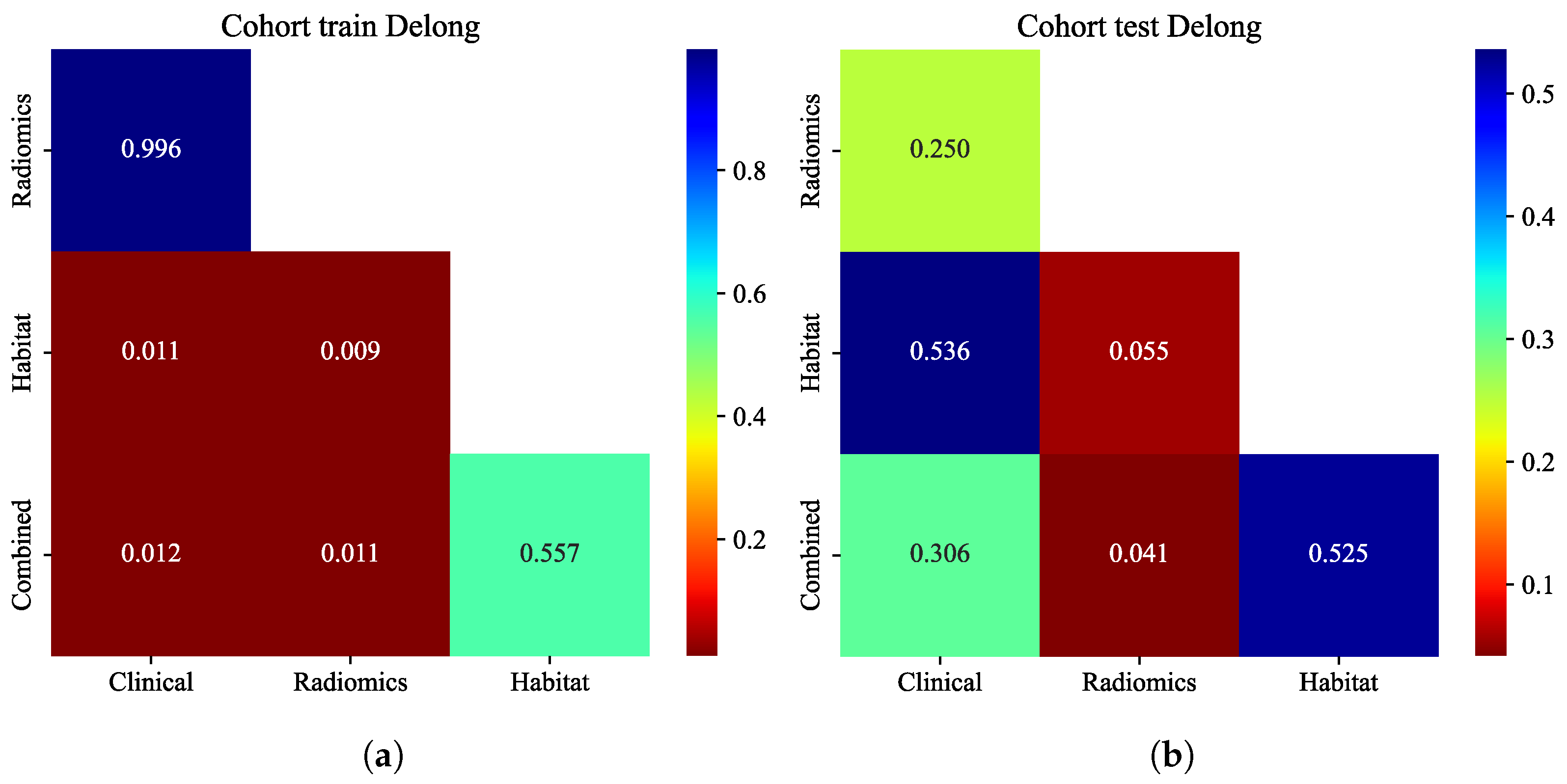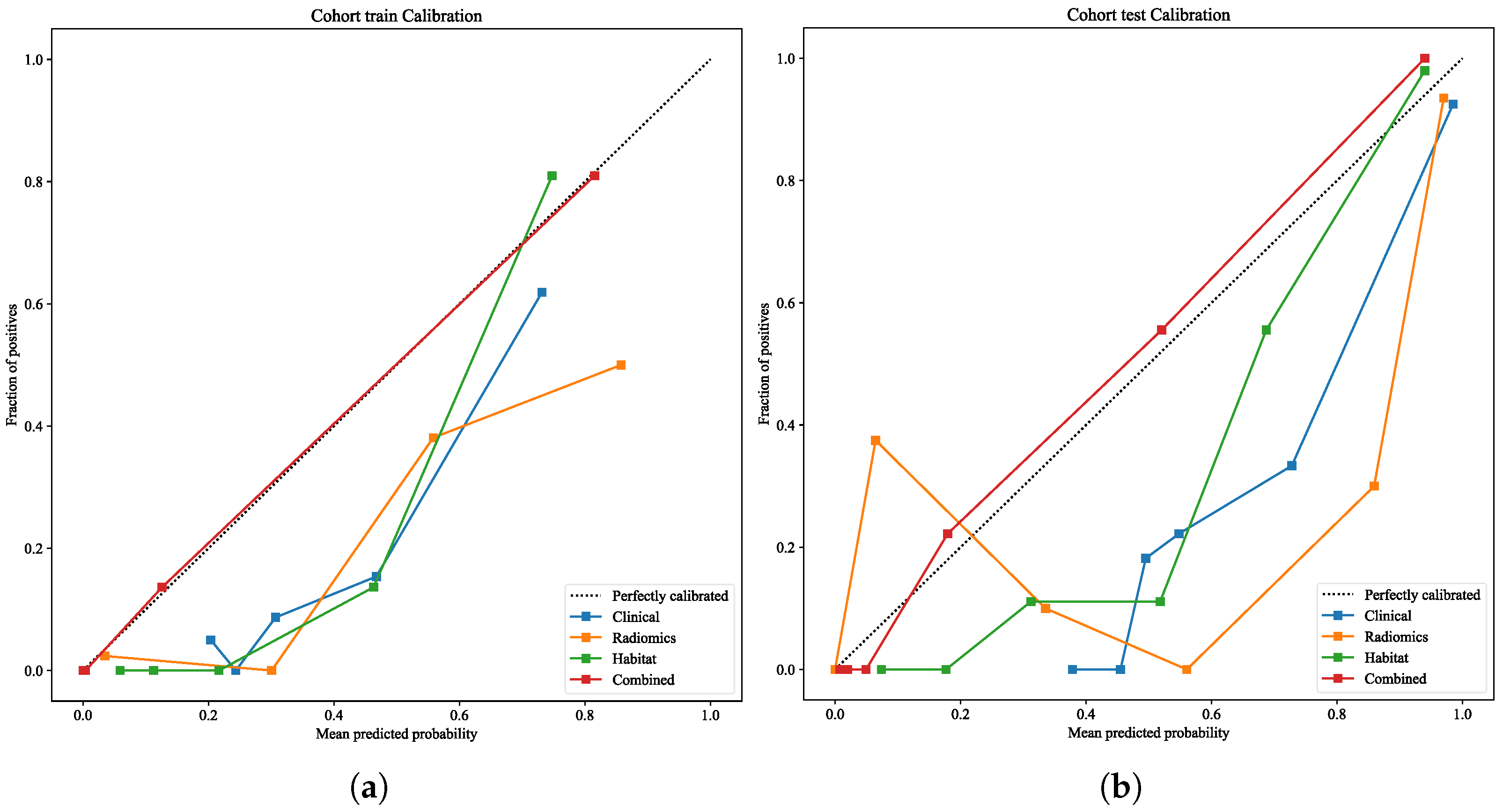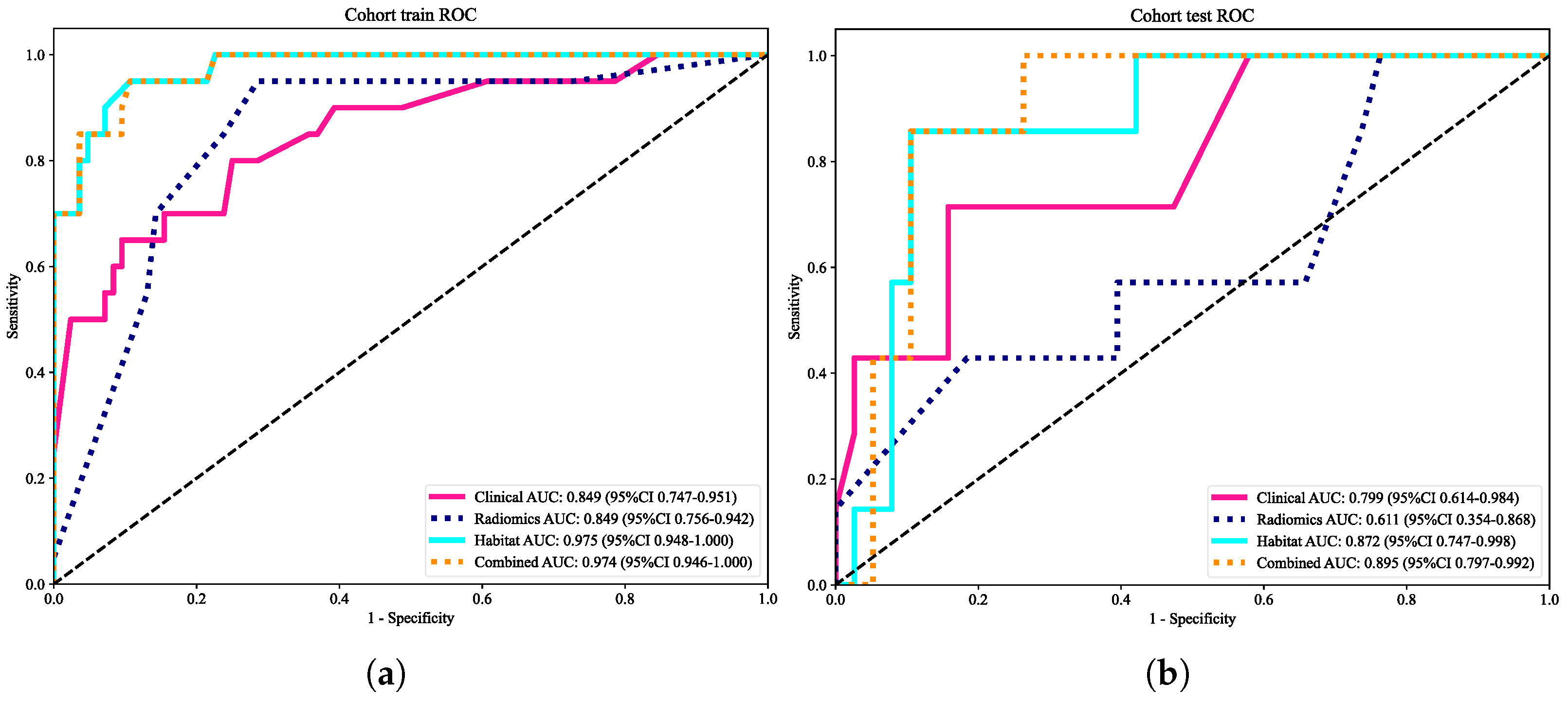 - Construction and validation of prediction models. We developed and validated four models, including clinical models, conventional radiomics models, habitat radiomics models, and combined models. In the internal independent validation cohort, the AUCs of the four models were 0.799, 0.611, 0.872, and 0.895, respectively. Among them, the combined model achieved the best overall performance, and calibration and decision curve analyses confirmed its reliability and clinical utility. The nomogram generated by the model may reduce unnecessary surgical exploration, enable accurate individualized risk stratification, and optimize preoperative management strategies for cervical cancer [7,14,15,16,17].
