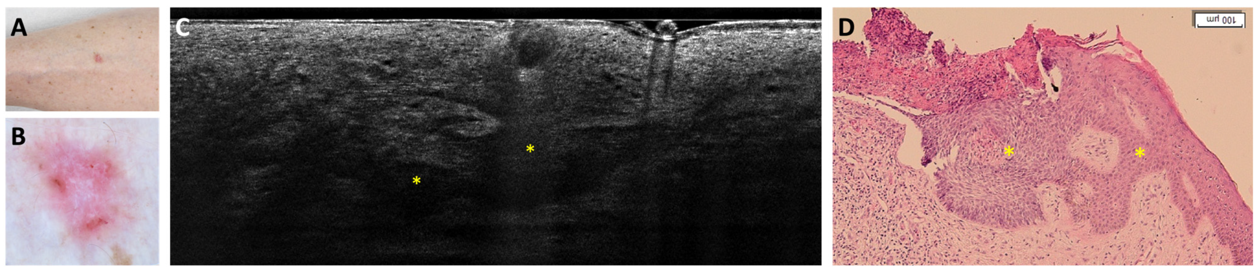 - Cinotti, E.; Tognetti, L.; Cartocci, A.; Lamberti, A.; Gherbassi, S.; Orte Cano, C.; Lenoir, C.; Dejonckheere, G.; Diet, G.; Fontaine, M.; et al. Line-field confocal optical coherence tomography for actinic keratosis and squamous cell carcinoma: A descriptive study. Clin. Exp. Dermatol. 2021, 46, 1530–1541. [Google Scholar] [CrossRef]