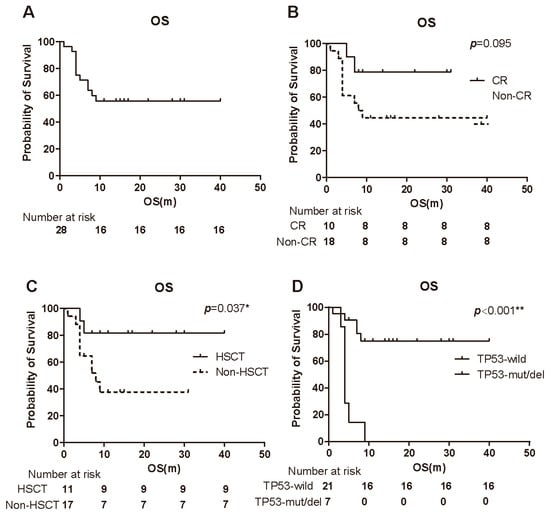 With a median follow-up of 8.5 months, 42.9% (12/28) of patients had died, while 57.1% (16/28) remained alive. The median OS for the entire cohort was not reached at the time of the analysis (Figure 2A). There was no significant difference in OS between responders and non-responders (Figure 2B). Although the difference in OS between the CR group and the non-CR group did not reach statistical significance (log-rank test, p = 0.095), the CR group showed a trend toward prolonged survival (not reached vs. 8.5 months; Figure 2B). Notably, patients who underwent HSCT exhibited superior survival compared to those who did not receive transplantation (log-rank test, p = 0.037; Figure 2C). Additionally, patients with TP53 mutations or deletions had significantly shorter OS compared to those without these genetic abnormalities (log-rank test, p < 0.001; Figure 2D).