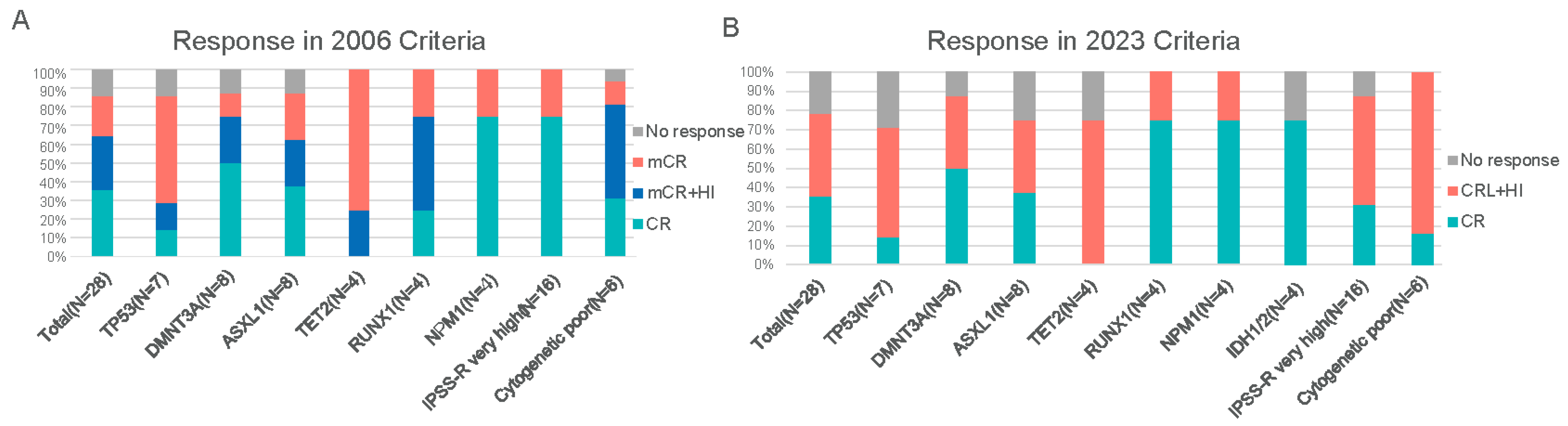 Patients received venetoclax, initiated at 100 mg daily and escalated to 400 mg over three days, from days 1 to 15 of each 28-day cycle, in combination with standard-dose azacitidine (75 mg/m2 on days 1–7 of each cycle). Antibiotic prophylaxis was mandated for all patients during the initial cycles and continued for those experiencing grade 3 neutropenia. Investigators were permitted to administer granulocyte colony-stimulating factor (G-CSF) to manage febrile neutropenia or neutropenic sepsis. The venetoclax dosage was adjusted for patients receiving concomitant CYP3A inhibitors, particularly azole antifungals. For patients on moderate CYP3A inhibitors (e.g., isavuconazole), the venetoclax dose was reduced by 50%, whereas for those on strong CYP3A inhibitors (e.g., voriconazole, posaconazole), the dose was reduced by 75%, as per established guidelines. Treatment was not interrupted for clinically insignificant cytopenia, such as neutropenia or thrombocytopenia, but could be suspended in cases of grade 4 febrile neutropenia or grade 4 thrombocytopenia with life-threatening bleeding. Efficacy assessments were performed after Cycle 2, and treatment cycles were repeated every 4–6 weeks until disease progression, intolerable toxicity, patient withdrawal, or HSCT. Final follow-up was completed in January 2024 through clinic visits or telephone interviews. At baseline, bone marrow single-cell suspensions were analyzed for mutations in 27 of 28 patients (96.4%). Genomic DNA was extracted from bone marrow cells, amplified using AmpliSeq multiplex PCR (Thermo Fisher Scientific, Waltham, MA, USA), and sequenced using next-generation sequencing (NGS) on the NovaSeq 6000 platform (Illumina, San Diego, CA, USA). Sequencing data were interpreted using a dedicated hematology-oncology database. FLT3 internal tandem duplication (ITD) mutations were identified by capillary electrophoresis fragment analysis and NGS, performed at Wuhan Kangshengda Medical Testing Laboratory. The average sequencing depth was 2000×, with a variant allele frequency (VAF) > 1% considered positive. Following two cycles of induction therapy, 11 patients proceeded to allogeneic HSCT.