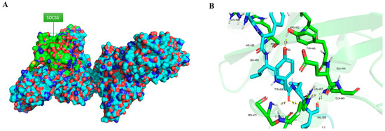 (A) Interaction between SOCS6 and EPOR in PyMOL, (B) Polar bond between SOCS6 and EPOR (green = SOCS6, blue = EPOR).