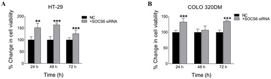 3.2.2. SOCS6 Silencing Enhanced Cell Viability in HT-29 and COLO 320DM Cells