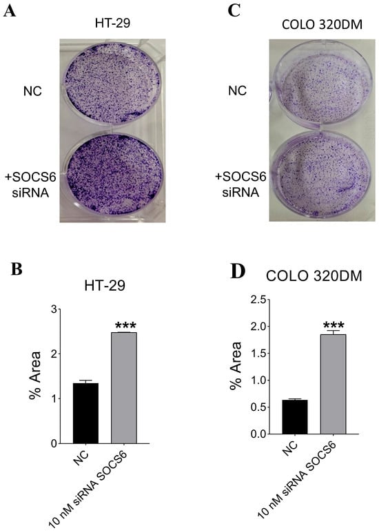 Effect of SOCS6 silencing on clonogenic potential of colorectal cancer cells. HT-29 (A,B) and COLO 320DM (C,D) cells were transfected with 10 nM SOCS6-targeting siRNA or negative control siRNA (NC), and colony formation assays were performed to evaluate long-term proliferative capacity. p-value of Mann-Whitney (in HT-29) and t-test (in COLO 320DM) comparing to the NC group: *** p < 0.001.