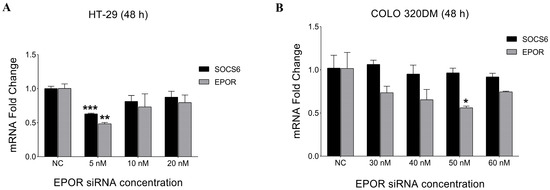 To determine the optimal EPOR siRNA concentration, HT-29 and COLO 320DM cells were transfected with different siRNA concentrations (5 nM–60 nM) for 48 h. Subsequently, RT-PCR was performed. The results demonstrated that 5 nM was the optimal concentration that showed a significant decrease in EPOR expression in HT-29. However, 50 nM EPOR siRNA concentration was the most efficient in silencing COLO 320DM cells (Figure 6). SOCS6 expression was quantified after EPOR knockdown, revealing a significant decrease in HT-29 cells but no change in COLO 320DM cells.
