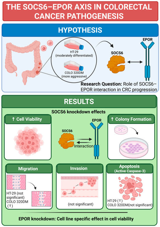 This study aimed to investigate SOCS6 expression and elucidate its association with EPOR in colorectal cancer. The summary of the results is illustrated in Figure 8.