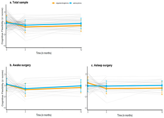 Descriptive trajectories of patients’ mean performances over time on the Shifting Attention test (measuring cognitive flexibility), in (a) the entire sample, (b) the sample undergoing awake surgery, and (c) the sample undergoing asleep surgery. Grey lines indicate individual patients z-scores over time, the orange and blue line indicate the mean group performance (±SDs) of oligodendroglioma and astrocytoma patients respectively. Estimated performance trajectories based on the multivariable models are provided in the Supplementary Materials.