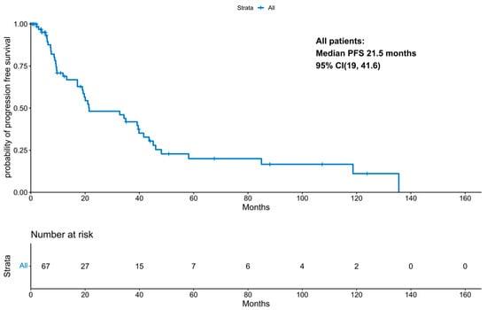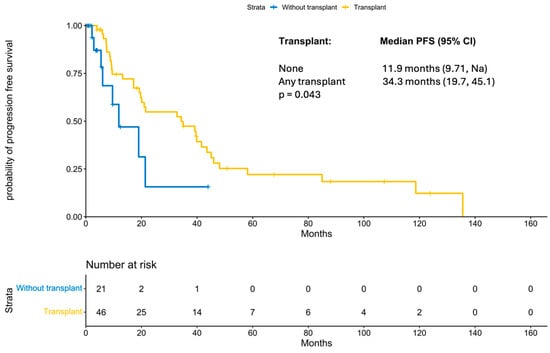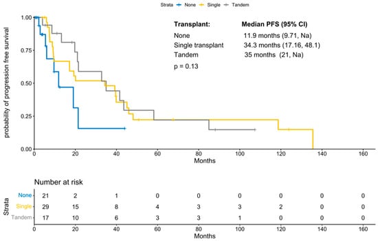 With a median follow-up period of 131 months (IQR 21.47 months, NA), the median progression-free survival was 21.5 months (95% CI 19; 41.58 months; Figure 1). PFS improved significantly in those patients who underwent a transplant (11.87 months vs. 34.3 months, p-value: 0.04; Figure 2). Interestingly, patients who underwent a tandem transplant did not derive additional benefits compared to those who were transplanted once (PFS 34.97 vs. 34.32 months, p-value: 0.13; Figure 3).