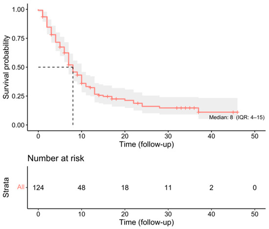 Kaplan–Meier survival curve for the whole cohort demonstrating a median survival of 8 months (dashed line).