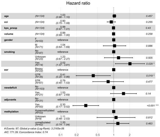 Forest plot indicating results of the cox proportional hazards model. In this multivariate assessment, significant predictors favouring better survival are GTR or STR and having received adjuvant chemoradiotherapy. Factors favouring worse survival include a history of smoking. Significance indicated using: * is p < 0.05, and *** is p < 0.001.