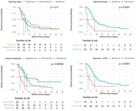 On univariate analysis, median survival increased with resection extent—3 months for biopsy (95% CI 2–7), 8 months for STR (95% CI 8–NA), and 10 months for GTR (95% CI 7–11; p = 0.0005; Figure 3)—and with receipt of adjuvant therapy (10 months vs. 2 months; p < 0.001). Smoking was not significant on univariate comparison (p = 0.11). Patients receiving adjuvant therapy with either GTR or STR had the longest median survival (10 months, 95% CI 9–13) compared with 3 months (95% CI 2–6) in those who received neither.