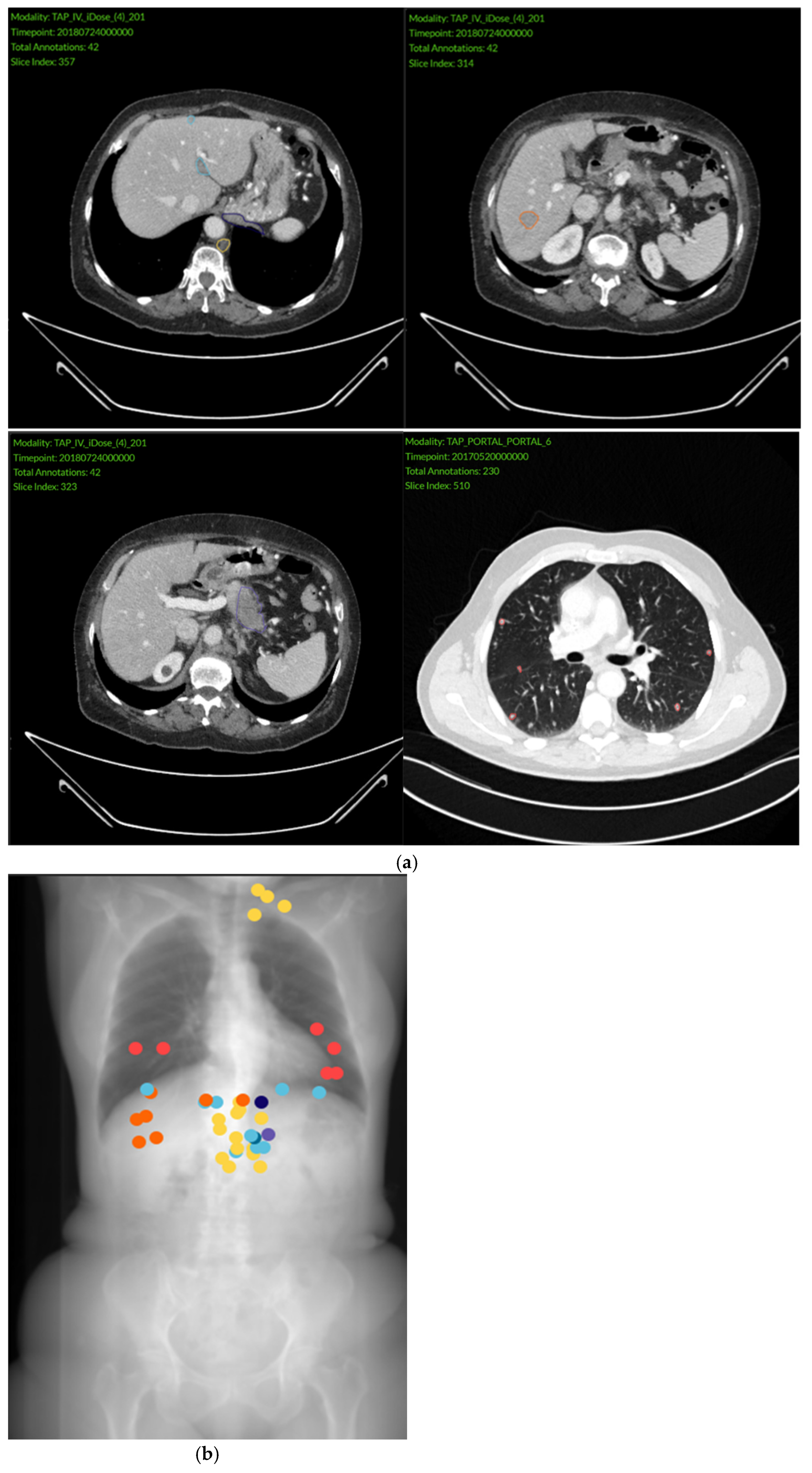 - Gebauer, L.; Moltz, J.H.; Mühlberg, A.; Holch, J.W.; Huber, T.; Enke, J.; Jäger, N.; Haas, M.; Kruger, S.; Boeck, S.; et al. Quantitative Imaging Biomarkers of the Whole Liver Tumor Burden Improve Survival Prediction in Metastatic Pancreatic Cancer. Cancers 2021, 13, 5732. [Google Scholar] [CrossRef]
