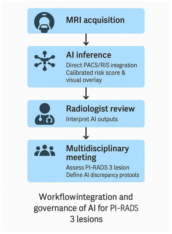 For AI systems to be adopted safely in clinical practice, they must integrate smoothly into existing radiology and urology workflows, including direct compatibility with PACS/RIS platforms and structured reporting systems. Such integration is essential for reproducibility, clinician trust, and real-world usability [64]. Beyond simple accuracy metrics, AI tools must be intuitive, traceable, and clinically interpretable, with explainable outputs that highlight the imaging regions contributing to the prediction; these principles align with established reporting and transparency frameworks such as the Checklist for Artificial Intelligence in Medical Imaging (CLAIM) [65] and foundational work on explainable machine learning [66]. The importance of transparency and standardisation has further been underscored by the PI-CAI international benchmark, which demonstrated how open-source model weights, preprocessing pipelines, and evaluation frameworks enable fair comparison across institutions and promote reproducible model development [13]. Together, these elements establish the foundation for clinically deployable AI systems that support radiologist-led decision-making while meeting regulatory expectations for interpretability, robustness, and safety. Incorporating these elements creates a workflow in which AI augments, rather than replaces, expert judgement. A schematic model of this recommended workflow is presented in Figure 1, illustrating the sequential steps from MRI acquisition through AI inference, radiologist review, and multidisciplinary decision-making.