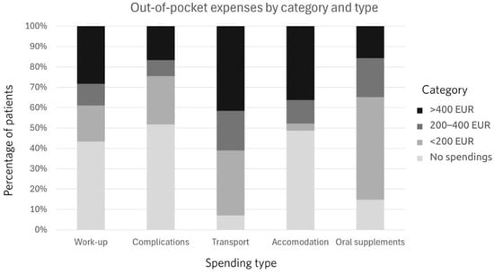 Interestingly, 32 of our patients reported OPPC exceeding 400 euros for diagnostic investigations (mostly CT and MRI) that were not available in a timely manner. Nutritional supplements are not covered by the national insurance system, yet 62% of patients reported spending up to 400 euros on them. Büttner et al. reported a mean monthly OOP expenditure of 206 euros during the first three months after hospitalization, decreasing to 148 euros after 15 months and an annual mean of 1776 euros [24]. Massa et al. reported a median annual OOP expenditure of 8384 dollars for head and neck cancer patients, significantly higher than for other cancer types [9]. However, cross-study comparisons remain challenging, as methodologies differ: some report raw OOP costs in different currencies, others report income proportions, and some categorize spending intervals.