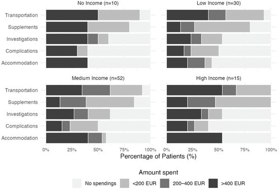 Proportional distribution of out-of-pocket payments across spending categories among patients who declared their monthly income. Income classifications are defined as: Low Income (<500 EUR), Medium Income (500–1000 EUR), and High Income (>1000 EUR).