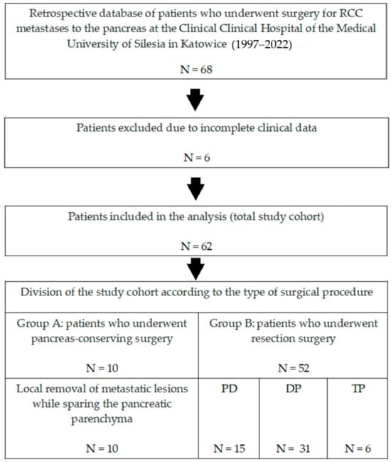 A retrospective analysis of 68 patients with metastatic renal cancer to the pancreas who underwent pancreatic surgery at the Department of Gastrointestinal Surgery of the Medical University of Silesia in Katowice (Poland) between 1997 and 2022 was performed. After excluding 6 patients with incomplete clinical data, data from 62 patients who underwent surgery during the study period were retrospectively analyzed. Demographic data, details of metastatic lesions, information about surgical procedures, analysis of the postoperative course, histological data of postoperative samples, and information on oncological follow-up after surgical treatment were collected. Patients were divided into two groups (Figure 1):