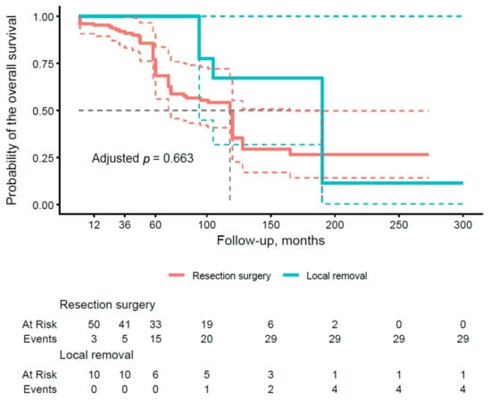The results presented in Table 4 illustrate the OS rates after 1, 3, and 5 years of follow-up, stratified by type of pancreatic surgery. With respect to local removal (group A), the surgical subgroup demonstrated an excellent OS of 100.0% (95% CI: 100–100) at all time points (1, 3, and 5 years), which contrasts with lower values in group B (89.5%, 83.2%, and 68.4%, respectively). The analysis shows a trend toward better OS rates in the subgroups with conservative approaches compared to more radical resections. Figure 2 illustrates the OS curve by type of pancreatic surgery (group A vs. group B). The curve for group B shows a more rapid decline in survival after 36 months, whereas group A maintains a more stable survival rate, remaining at 100% until after 60 months and approaching 60% at the end of the period. The adjusted p-value of 0.663 does not reach significance, implying no clear advantage of one approach over the other in terms of OS, although the trend reveals a potential benefit of sparing techniques in selected patients.