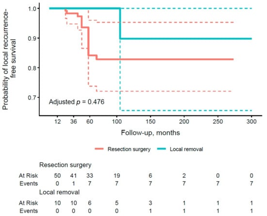 According to results in Table 5, group A again demonstrated excellent PFS of 100.0% at all time points, contrasting with lower rates in group B (100.0% at 1 year, 98.3% at 3 years, and 84.1% at 5 years). These results suggest a trend toward better PFS in the conservative treatment group for preventing local recurrence, consistent with patterns observed in OS rates. Figure 3 shows the PFS curve for local recurrence by type of operation. The curve for group B is lower, with more events accumulating by 60 months, while group A maintains a higher PFS throughout the period. The adjusted p-value of 0.476 does not reach significance, indicating no statistically significant effect of the type of procedure on this endpoint.