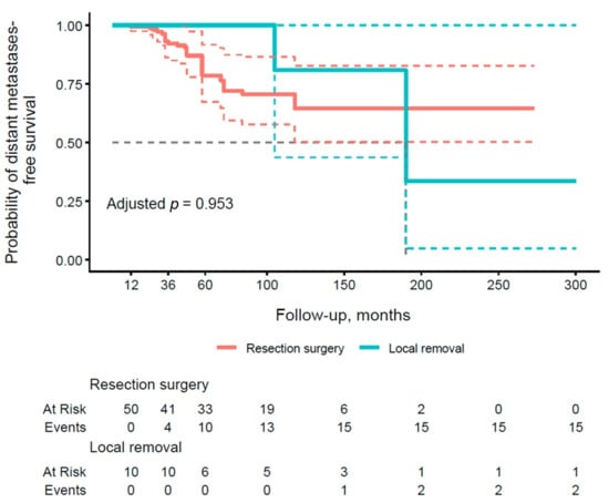 The results presented in Table 6 illustrate distant metastasis PFS rates at 1, 3, and 5 years of follow-up, stratified by type of pancreatic surgery. With respect to local removal (group A), the subgroup demonstrated an excellent PFS of 100.0% (95% CI: 100.0–100.0) at all time points, contrasting with lower values in group B (99.4% at 1 year, 92.2% at 3 years, 78.6% at 5 years). Figure 4 illustrates the PFS curve for distant metastases by type of operation. The resection group (group B) demonstrated a lower PFS, with events accumulating by 60 months, but the adjusted p-value of 0.953 did not confirm significance.