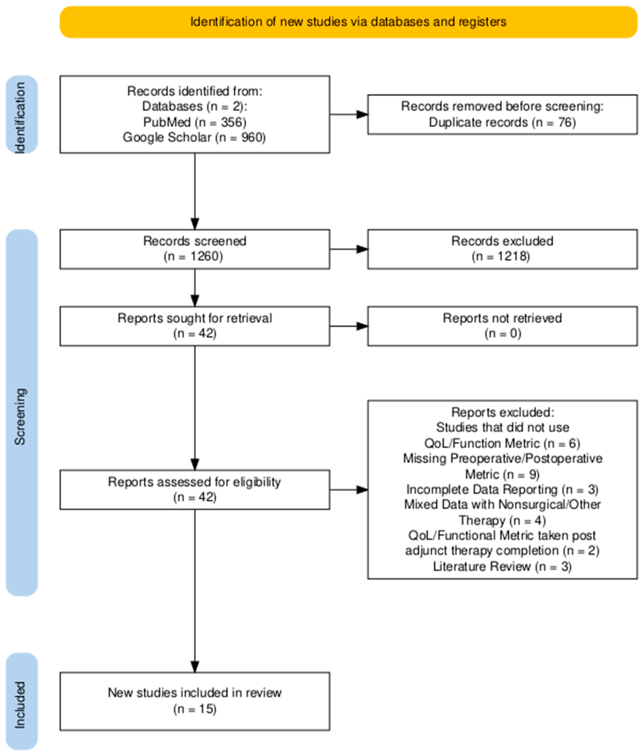 The exclusion criteria specified studies that did not report QoL or functional metrics (n = 6), did not include preoperative/postoperative function/QoL metrics (n = 9), or had incomplete data reporting (n = 3); studies in which patient data from nonsurgical or other therapy groups were reported together (n = 4); studies that reported functional/QoL measurements taken after completion of adjunct therapies (n = 2); studies not in English (n = 0); studies explicitly focusing on pediatric patients (n = 0); and literature reviews (n = 3). This resulted in 27 references being discarded, leaving 15 studies (Figure 1) [12].