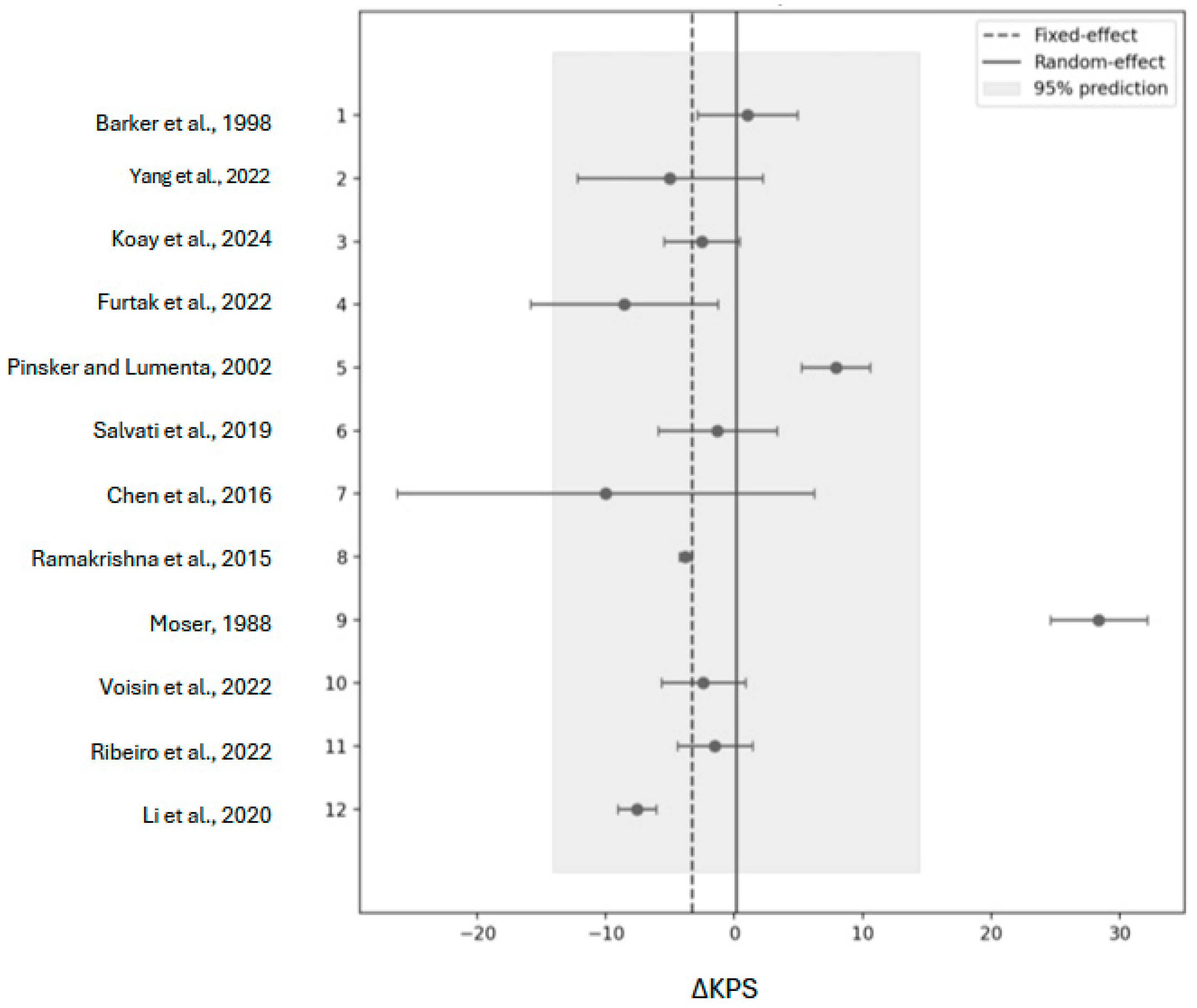 Figure 2. Mean change in function outcomes after reoperation. Forest plot of 12 studies’ mean KPS change [13,14,15,16,18,19,20,21,22,23,24,25]. Each dot represents a study’s mean change in Karnofsky Performance Score (ΔKPS) with its 95% confidence interval. The dashed line marks the fixed-effect pooled estimate (−3.3 KPS), which assumes one common true effect. The solid line is the random-effects pooled estimate (+0.2 KPS) that incorporates between-study variance (τ2 ≈ 48). The pale band shows the 95% prediction interval (−14.1 to +14.4 KPS); a future center’s true effect is expected to lie within this range. The single small cohort with a large positive change visibly widens the prediction band, illustrating the source of heterogeneity.