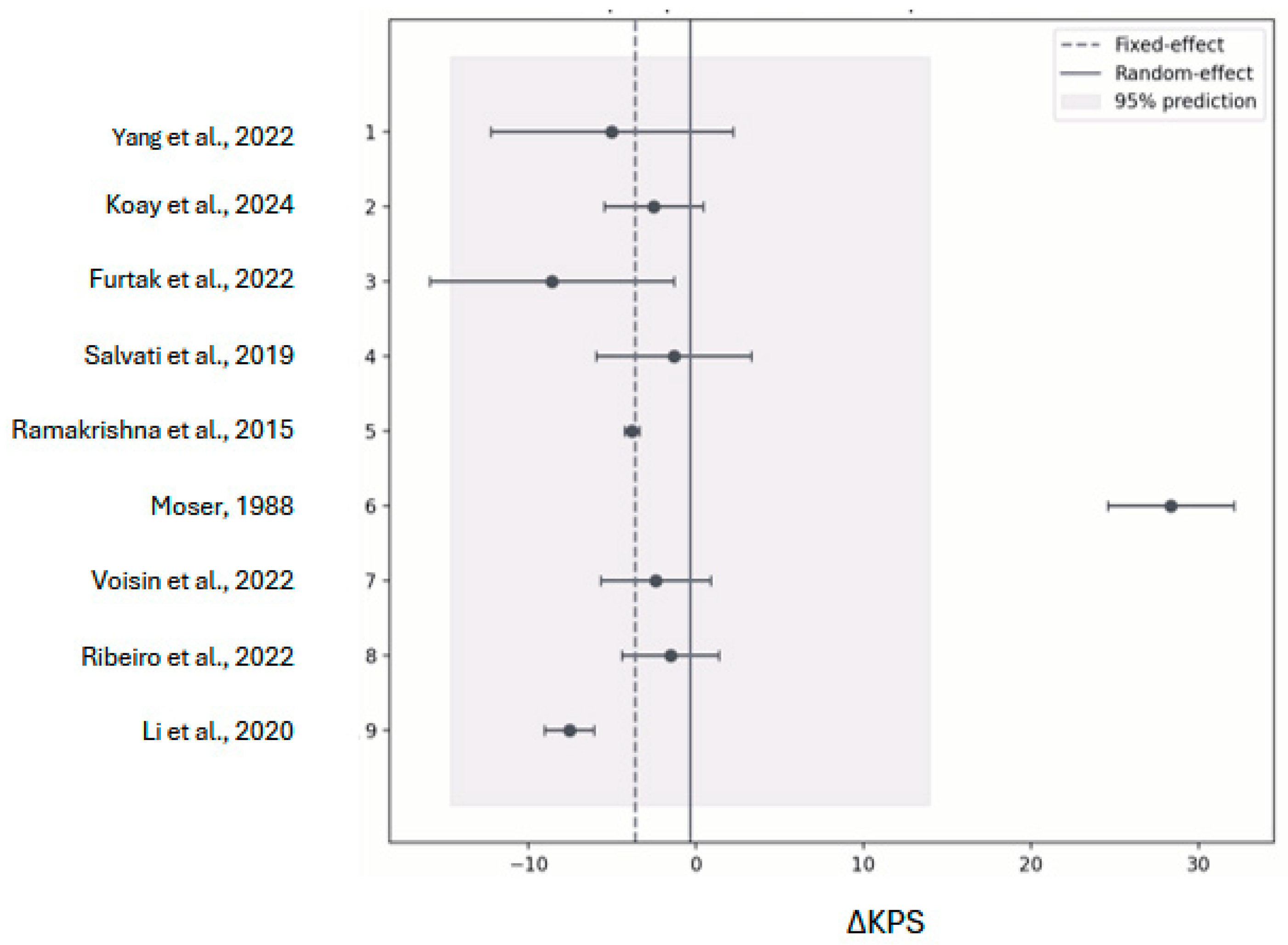 Additional analyses excluding the two pooled QoL cohorts and the median-derived cohort (nine studies, n = 567) yielded a random-effects mean of −0.33 KPS (95% CI: [−5.03 to +4.37]; z = −0.14, p = 0.89; τ2 ≈ 47), with a 95% prediction interval of −14.6 to +13.9 (Figure 3), confirming the robustness of the results without emphasizing any single outlier.