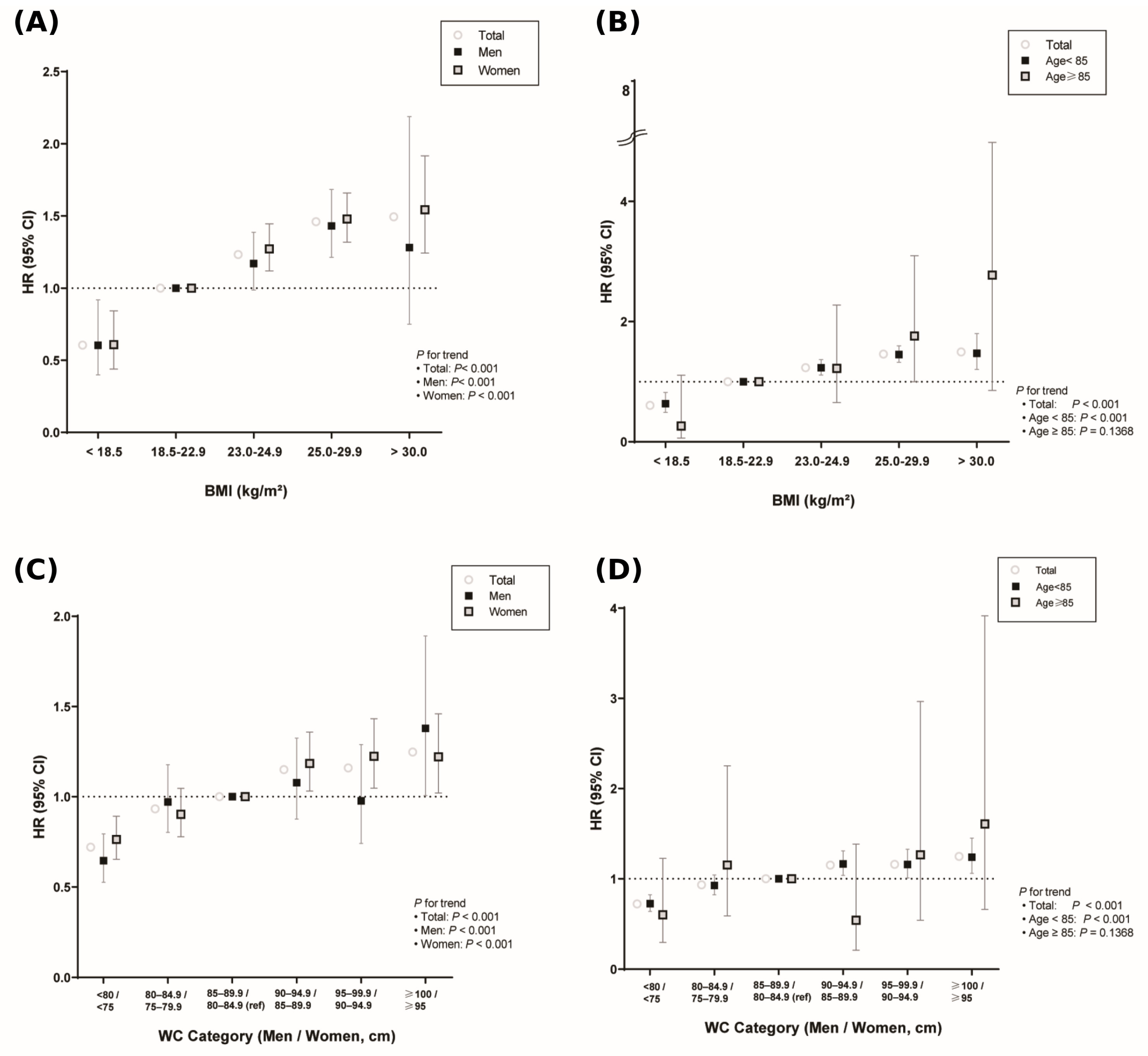 | Age < 85 | High WC | No | 714,703 | 1514 | 5,003,212.39 | 0.3 | 1.00 (ref.) | 1.00 (ref.) | 1.00 (ref.) | 1.00 (ref.) |