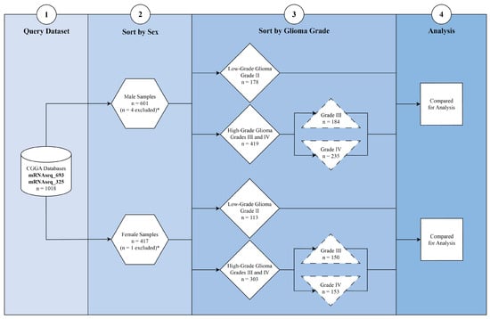 Cohort Stratification: Samples were stratified by sex (male vs. female) and histological grade: low-grade glioma (LGG; Grade II), high-grade glioma (HGG; Grades III and IV), and glioblastoma (GBM; Grade IV). Comparison groups were defined as LGG versus HGG and LGG versus GBM within each sex. This stratification enabled the identification of sex-specific molecular features associated with tumor grade (Figure 1). Samples annotated with ambiguous or mixed histologic grades were excluded from differential expression analyses to ensure clear separation between low-grade and high-grade glioma cohorts.