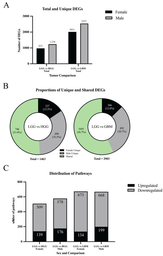 Sex-stratified distribution of DEGs and pathways. (A) Total and unique DEGs: bar chart comparing the number of total and sex-specific DEGs across tumor grade comparisons. (B) Proportions of unique and shared DEGs: donut plots showing the distribution of male-unique, female-unique, and shared DEGs in LGG vs. HGG and LGG vs. GBM comparisons. (C) Distribution of significantly altered pathways: bar plots display the number of upregulated and downregulated pathways in LGG vs. HGG and LGG vs. GBM comparisons for females and males.