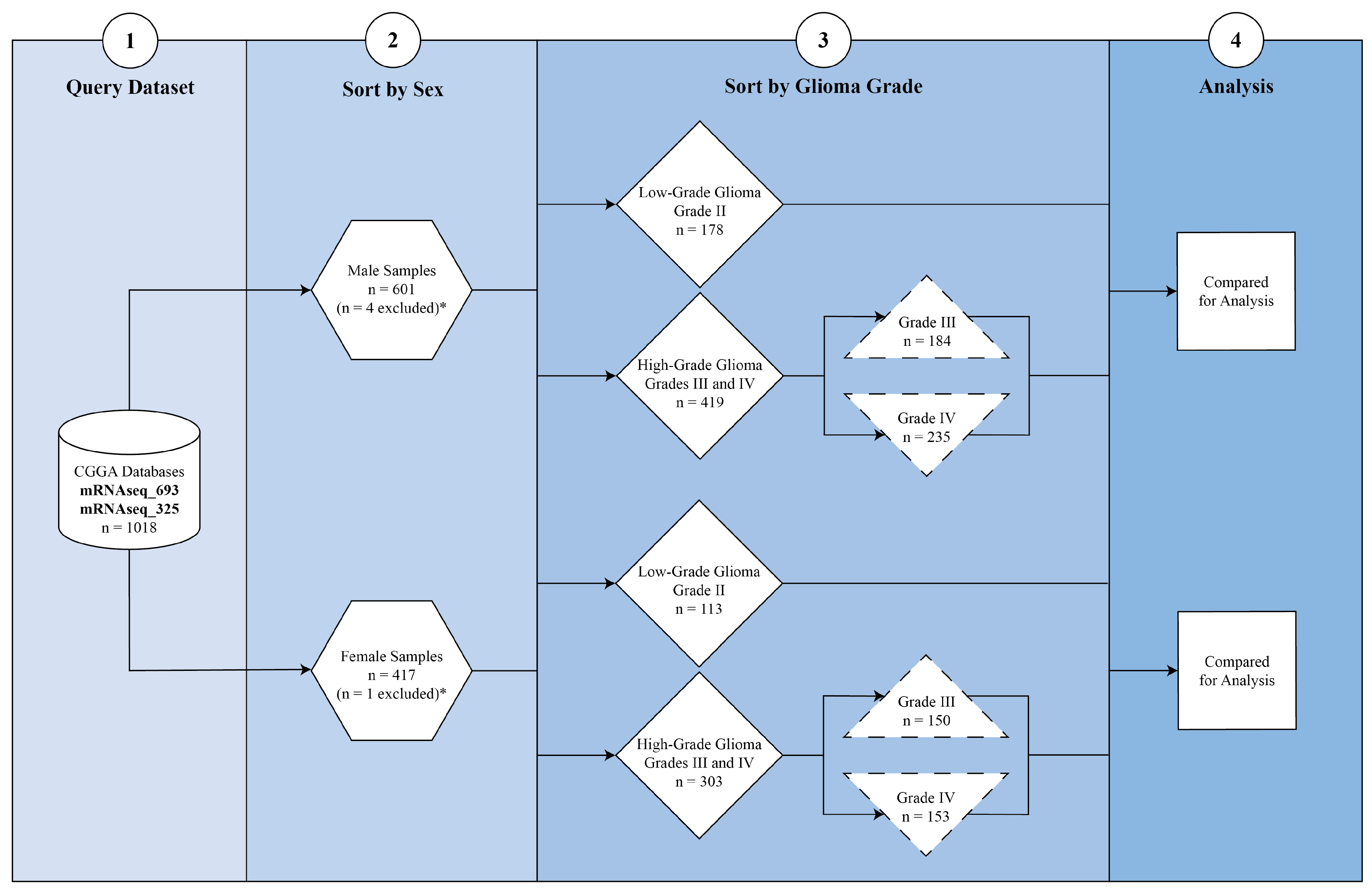 - Qin, S.; Yuan, Y.; Liu, H.; Pu, Y.; Chen, K.; Wu, Y.; Su, Z. Identification and characterization of sex-dependent gene expression profile in glioblastoma. Neuropathology 2023, 43, 72–83. [Google Scholar] [CrossRef]