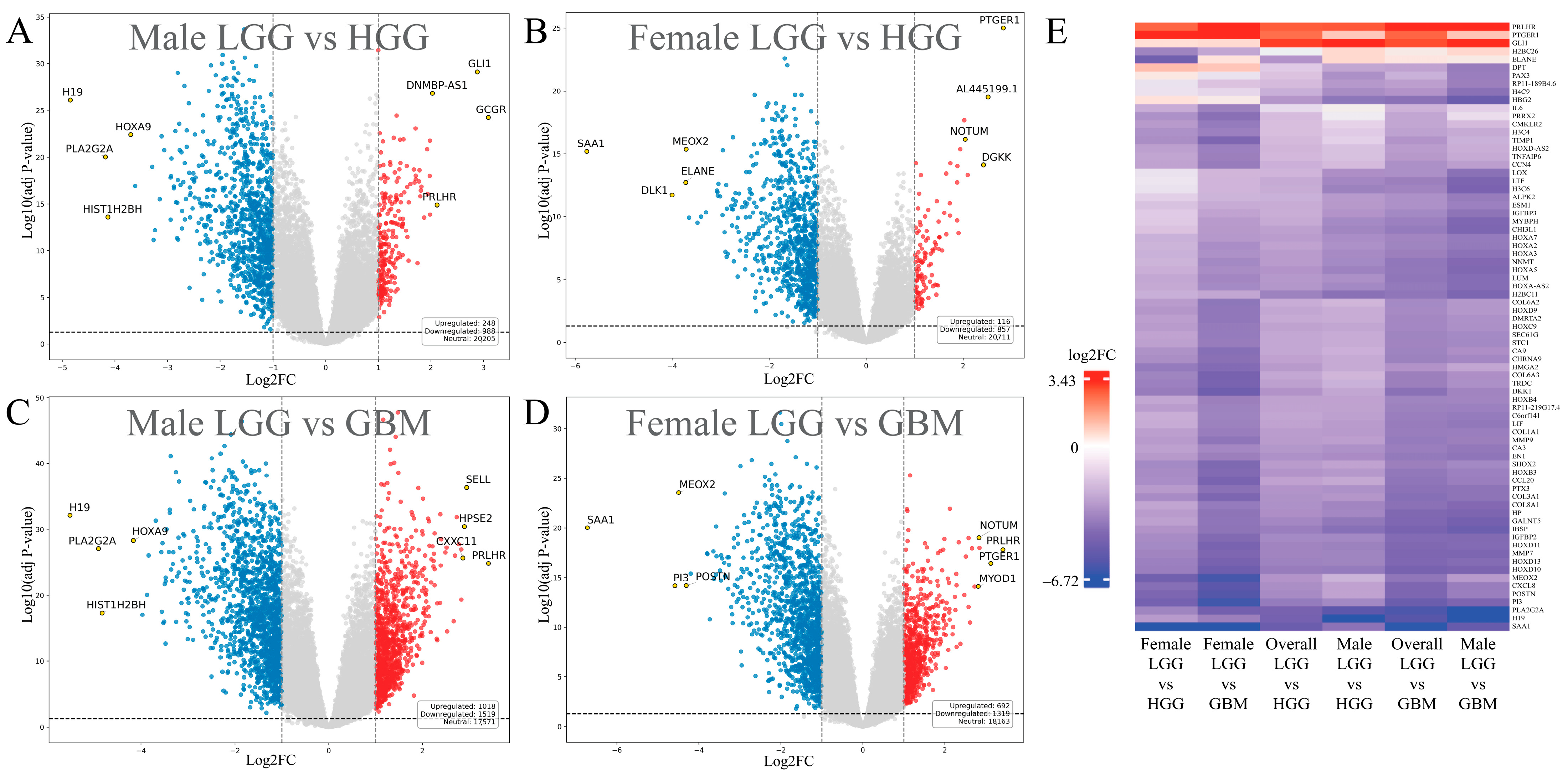 - Khan, M.T.; Prajapati, B.; Lakhina, S.; Sharma, M.; Prajapati, S.; Chosdol, K.; Sinha, S. Identification of Gender-Specific Molecular Differences in Glioblastoma (GBM) and Low-Grade Glioma (LGG) by the Analysis of Large Transcriptomic and Epigenomic Datasets. Front. Oncol. 2021, 11, 699594. [Google Scholar] [CrossRef]