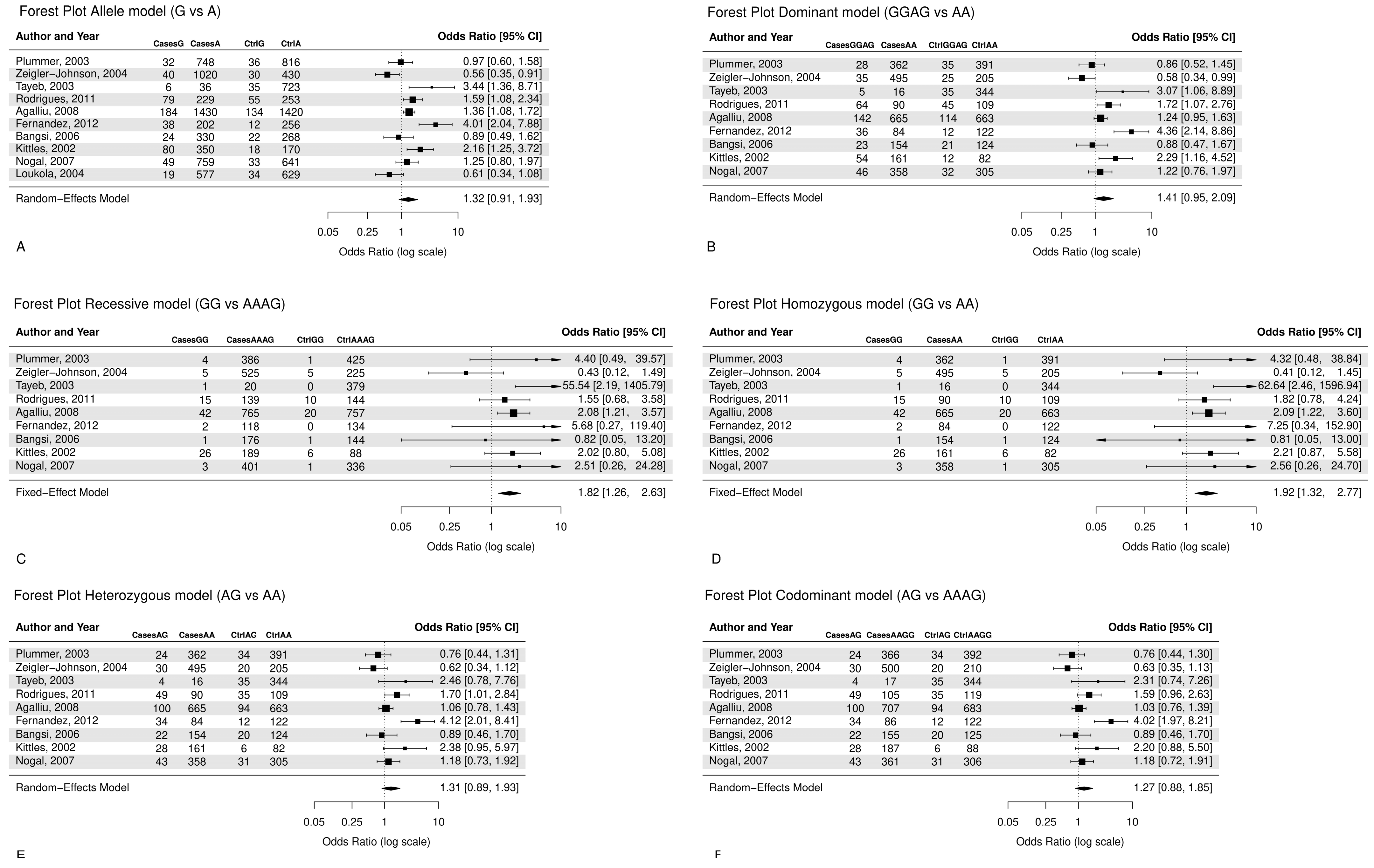 | Recessive (GG vs. AAAG) | 0.6003 | 0.1876 | 3.1997 | 0.0014 | 0.2326 | 0.9681 |