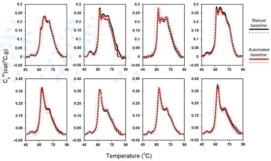 Comparison of automated and manual baseline correction for duplicate TLB profiles of 8 plasma samples.