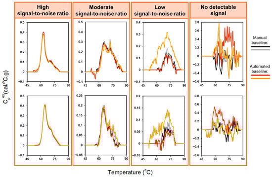 Comparison of automated and manual baseline correction for duplicate TLB profiles of 8 urine samples, with different amplitudes of the heat capacity signal: high signal-to-noise ratio, moderate signal-to-noise ratio, low signal-to-noise ratio, no detectable signal. The exclusion region used for the baseline-correction algorithm was set to 60–80 °C to accommodate the greater variability in thermal features observed for urine samples.