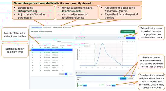 Following testing of the ThermogramBaseline package in R, both the baseline-correction and signal-detection workflows were reimplemented using R Shiny and integrated into ThermogramForge, a web-based platform providing expanded analytical functionality (Figure 6). The software automates batch processing, baseline endpoint detection, and signal classification while supporting manual refinement through an intuitive graphical interface.