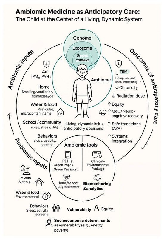 This evolution also mirrors a broader scientific and societal transition. In the context of the Anthropocene—where climate change, pollution, biodiversity loss, and urban stressors increasingly shape pediatric health—exposomic intelligence and ambiomic medicine align with planetary health principles [100,101,102]. By 2030, it is conceivable that survivorship clinics will routinely integrate exposomic dashboards; that environmental risk stratification will be as common as genomic sequencing; and that prevention will be as personalized as treatment. Ambiomic medicine does not replace precision medicine—it completes it—embedding treatment and survivorship within a living ecological context. At the European level, this ambiomic survivorship vision has inspired the AIREACH proposal (Air Quality and Integrated Risk Evaluation for Childhood, Adolescent and Young Adult Cancers), a multicentre consortium coordinated by Hospital Sant Joan de Déu (Barcelona) and submitted to the EU Mission Cancer call HORIZON-MISS-2025-02-CANCER-02 [80].