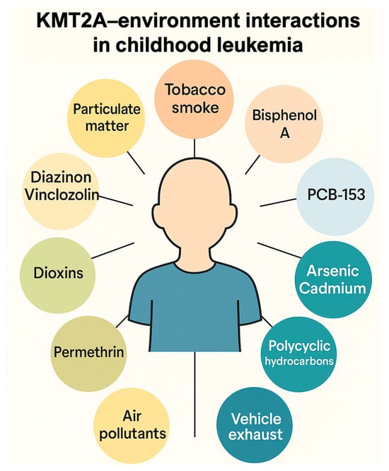 Example of ambiomic mechanistic insight: KMT2A–environment interaction network derived from the Comparative Toxicogenomics Database (CTD). The diagram shows selected environmental chemical interactors recurrently linked to KMT2A across CTD inference networks for “Leukemia”, “Precursor Cell Lymphoblastic Leukemia–Lymphoma”, “Cell Transformation, Neoplastic” and “Neoplasms”, grouped into major exposure domains (air pollutants and particulate matter, tobacco smoke and vehicle exhaust, metals and metalloids such as arsenic and cadmium, pesticides including diazinon and vinclozolin, and endocrine-disrupting/industrial chemicals such as bisphenol A and dioxins). These curated relationships illustrate how gene–environment networks can inform anticipatory, exposure-aware clinical decisions within ambiomic survivorship models. Infant KMT2A-rearranged leukemias are a paradigmatic model of gene–environment interaction: most arise prenatally, are driven by KMT2A fusion proteins that reprogram HOX-dependent transcription, and may be modulated by in utero and early-life environmental exposures. Source: Prepared by the authors.
