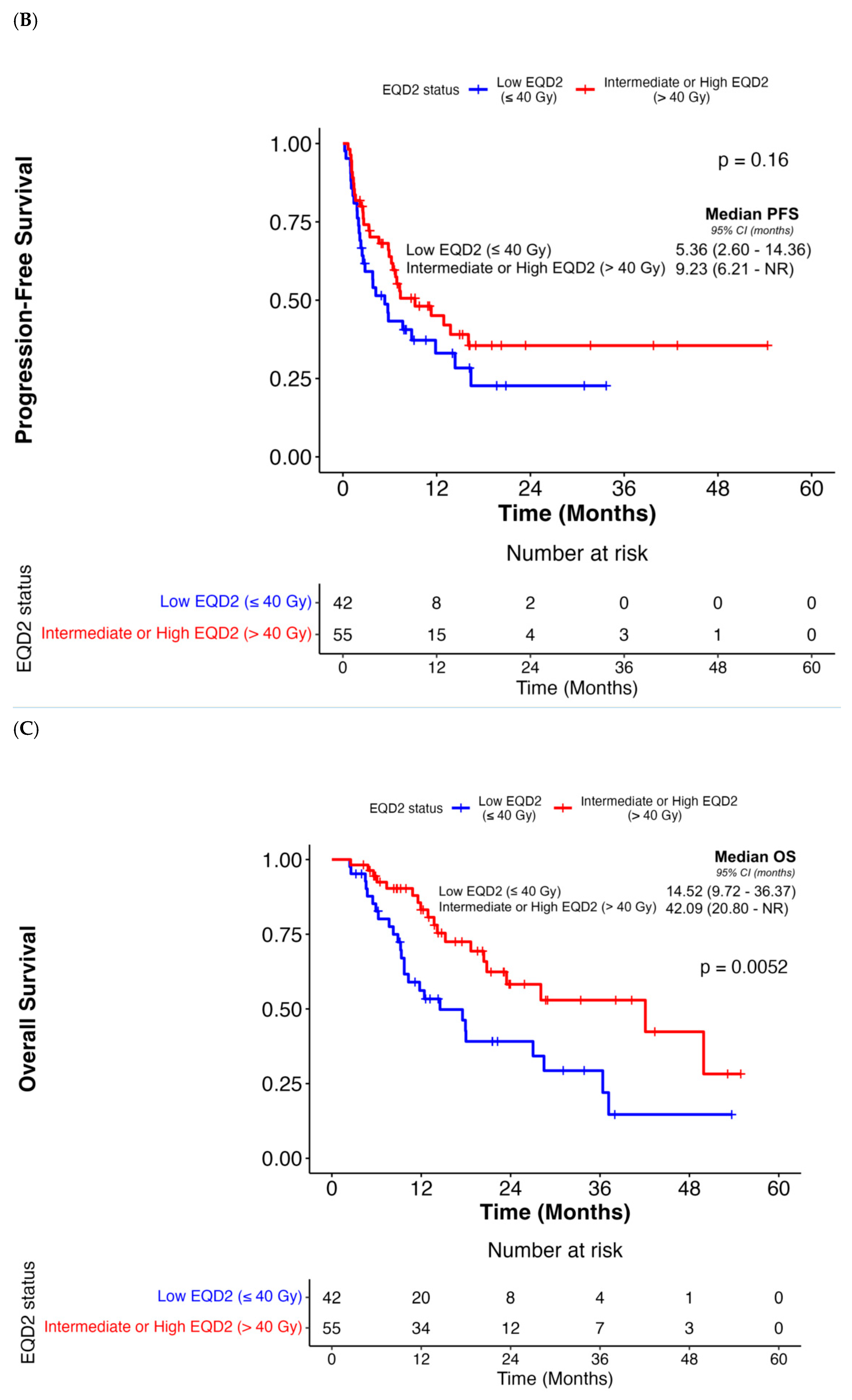 Outcomes were analyzed using Kaplan–Meier survival estimates and univariate and multivariate Cox proportional hazards models, with multivariate models incorporating covariates significant on univariate analysis. The Wilcoxon test was employed for comparisons between patient and treatment subgroups. Statistical significance was defined as p < 0.05, using log-rank tests to evaluate associations between clinical or treatment variables and LC, PFS, and OS. All analyses were conducted using R (v4.2.3), RStudio (v2022.12.0.353), and Microsoft Excel (v16.75).