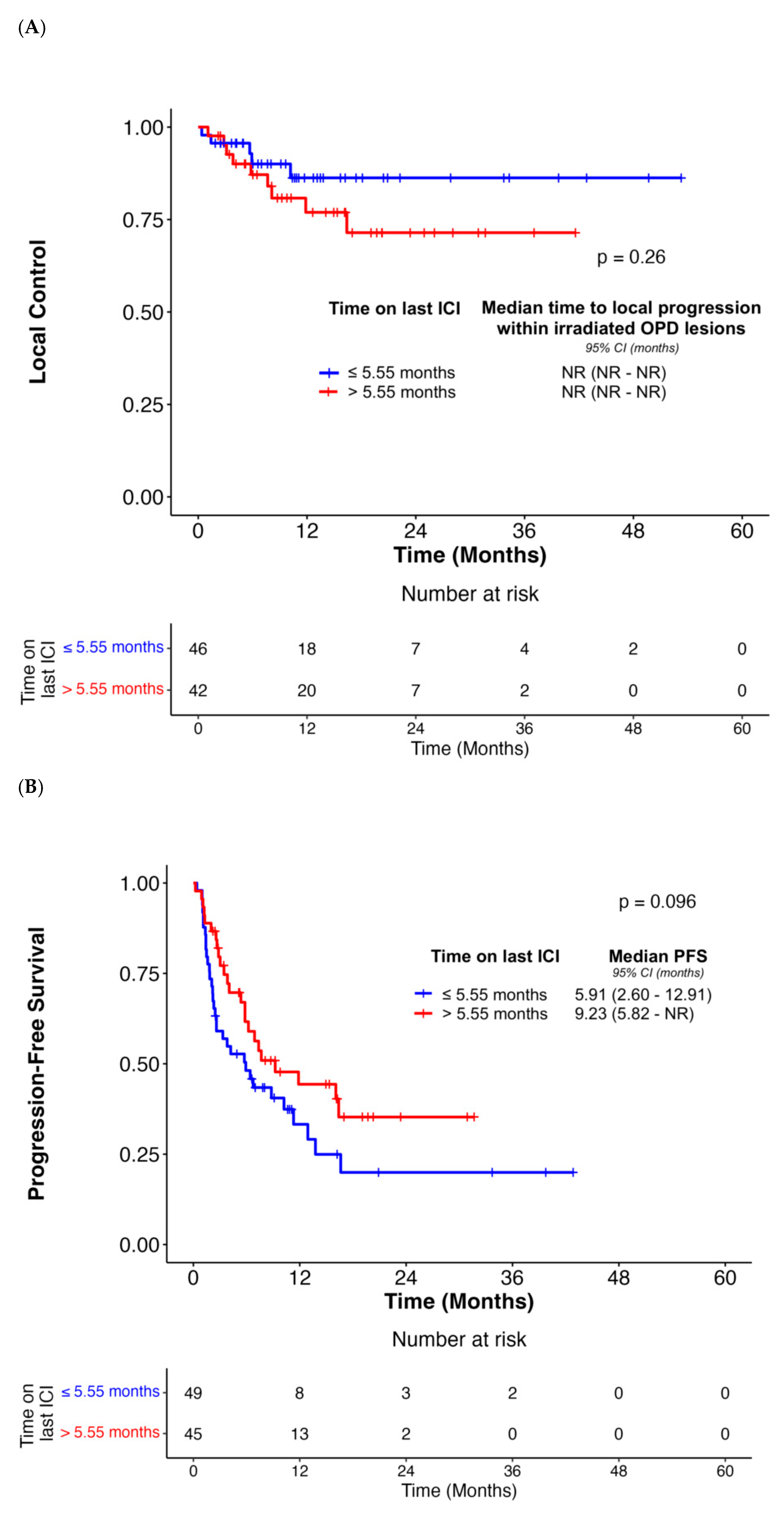 The increasing number of cancer patients receiving ICIs has led to more patients with either primary or acquired ICI resistance. Management of limited progression after ICI therapy remains unclear, though increasing evidence suggests some patients benefit from continued ICIs after local ablation or surgical removal of resistant disease [17,18]. This approach may provide a substantial clinical benefit, as subsequent lines of systemic therapy are often associated with shorter durations of response and increased toxicity relative to ICIs. However, the identification of patients with true OPD who are suitable for local therapy remains complex, and there is a paucity of data regarding which individuals experience the most favorable outcomes from local treatment of OPD. To address this question in the context of NSCLC, we reviewed outcomes for such patients developing OPD during ICI therapy and who received radiotherapy without starting a new systemic treatment regimen. To our knowledge, this review represents the largest analysis to date of NSCLC patients treated with radiotherapy after OPD on ICIs.