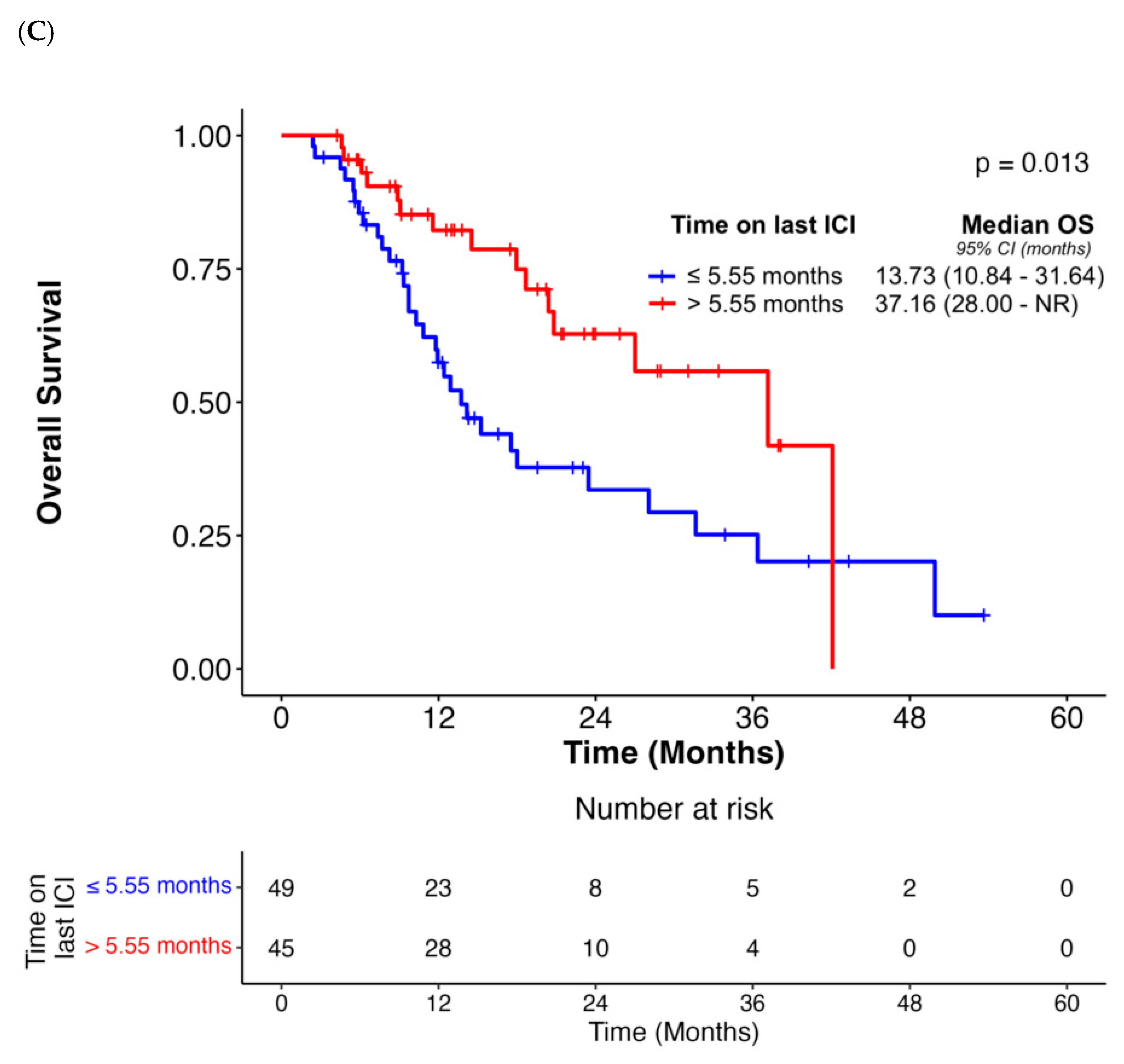 Moreover, the absence of an association between PD-L1 TPS and survival in this cohort, despite a correlation with prior ICI duration, underscores the limitations of PD-L1 as a standalone predictive biomarker. Duration of ICI may instead serve as a pragmatic, post-hoc indicator of clinical benefit that integrates multiple factors—including tumor biology, host immune response, and treatment tolerance—that are not captured by PD-L1 expression alone. This finding is consistent with prior observations that durable responses to ICIs can occur across PD-L1 expression levels [28,29]. Importantly, this observation does not diminish the role of PD-L1 in treatment selection but rather highlights the need for additional or composite biomarkers to better predict long-term benefit from ICIs.