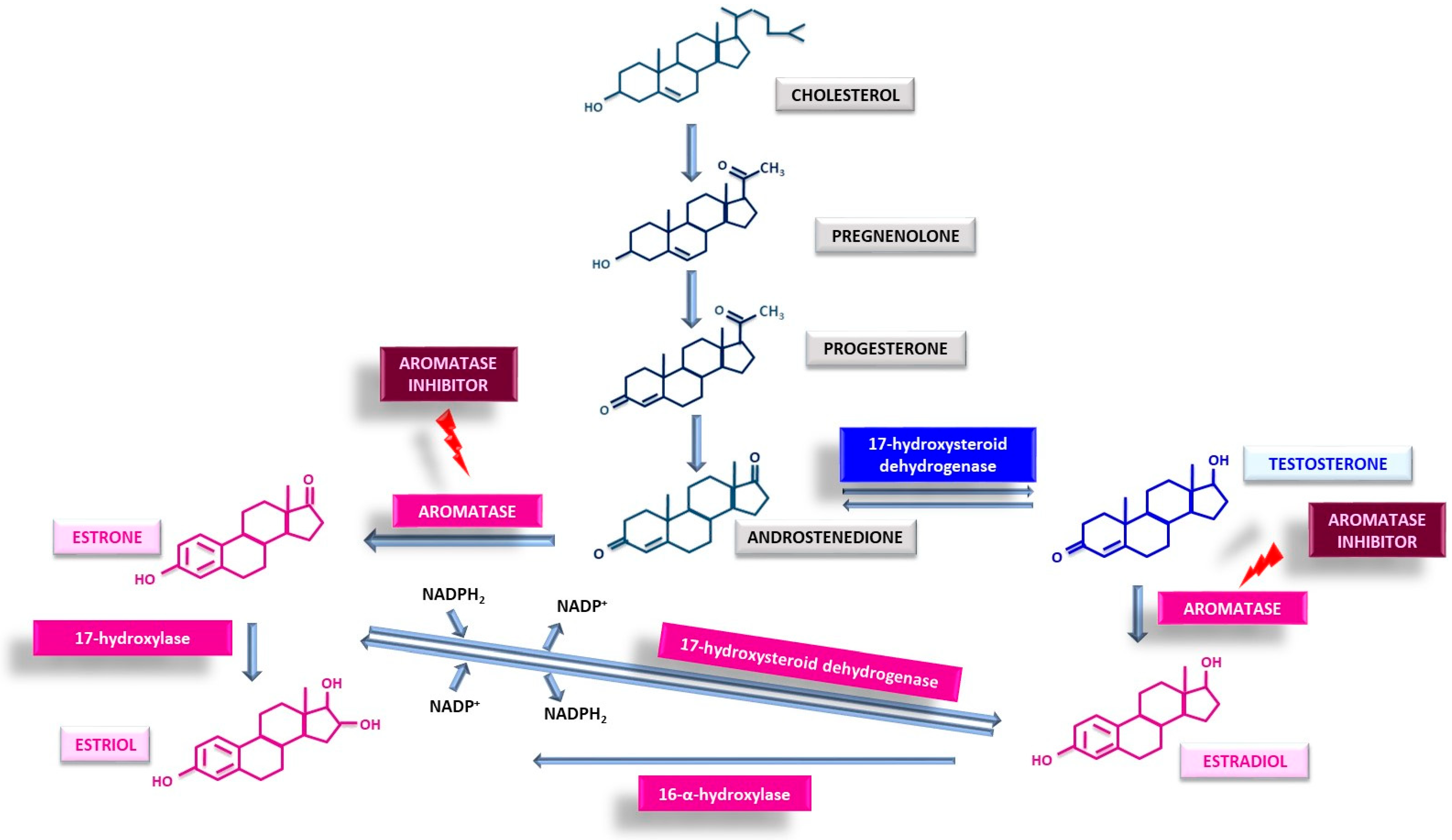 Estrogens are a class of steroid hormones with 18 carbon atoms synthesized in the human body comprising three active compounds: estradiol, the most potent and prevalent form, along with estriol and estrone [23,24]. They are produced by the ovaries with smaller quantities synthesized by the adrenal gland, placenta, liver, nervous system, and adipose tissue [25,26]. Estrogen biosynthesis originates from cholesterol and proceeds to androstenedione, following several transformations common to testosterone synthesis. From the androstenedione onward, aromatase plays a key role (Figure 1). In the initial stage of this common pathway, progesterone is formed through the dehydrogenation of pregnenolone followed by its conversion to androstenedione. Androstenedione can subsequently follow two metabolic paths: transformation into testosterone mediated by 17-hydroxysteroid dehydrogenase or conversion into estrone via the action of aromatase [27,28]. Estrone, in turn, will be converted either into estriol or estradiol, the latter of which can be subsequently transformed to estriol [29]. Thus, aromatase plays a crucial role in estrogen biosynthesis by acting on either testosterone or androstenedione, yielding the three primary estrogens which can undergo interconversion [30]. Consequently, the production of estrogens can be inhibited in the human body by targeting aromatase with AIs.