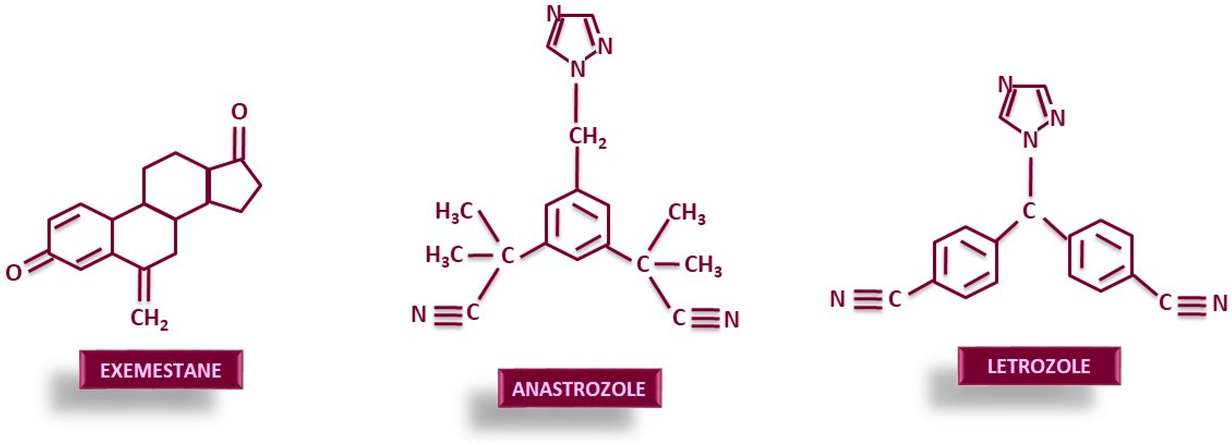 Tamoxifen was a breakthrough therapy in the management of breast cancer patients when it was introduced in the late 1960s and approved by U.S. Food and Drug Administration in 1977 [43,44]. In the current clinical landscape, there is a trend toward replacing tamoxifen with AIs in postmenopausal women. Furthermore, several clinical trials in premenopausal patients have indicated superior outcomes when combining aromatase inhibitors with ovarian function suppression (OFC), compared to that of tamoxifen plus OFC, or tamoxifen monotherapy [45]. Another aspect to consider is that approximately one-third of ER + BC cases develop tamoxifen resistance, which has a negative impact on the patient’s prognosis [46]. Consequently, alternative endocrine therapies must be evaluated [47]. Therefore, aromatase inhibitors are being increasingly explored as an alternative to tamoxifen in specific clinical scenarios. Although tamoxifen offered treatment advantages comparable to those of first- and second-generation aromatase inhibitors, the third-generation AIs have demonstrated superior efficacy [43]. Furthermore, endocrine treatment with aromatase inhibitors in postmenopausal women results in an additional proportional reduction in recurrence rates of approximately 30% [48]. Within the third generation of AIs, letrozole and anastrozole are non-steroidal compounds, while exemestane is a steroidal AI [49]. Some research comparing the third-generation aromatase inhibitors found that the best 5-year disease-free survival (DFS) was associated with letrozole, followed by exemestane, while the poorest outcome was observed with anastrozole [50].