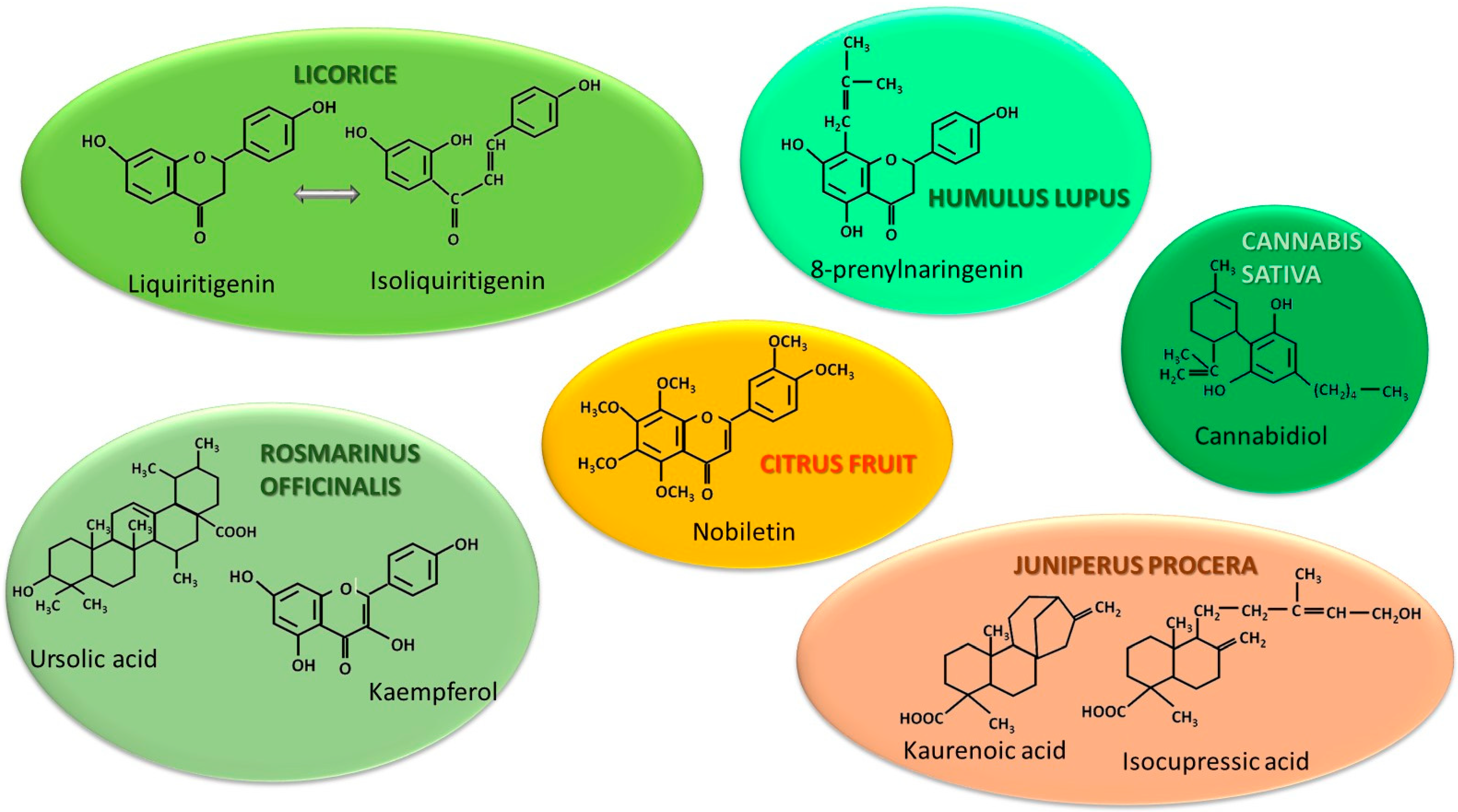 Humulus lupulus6-prenylnaringenin, xanthohumol [77]-6-prenylnaringenin, 8-prenylnaringenin [80,81]