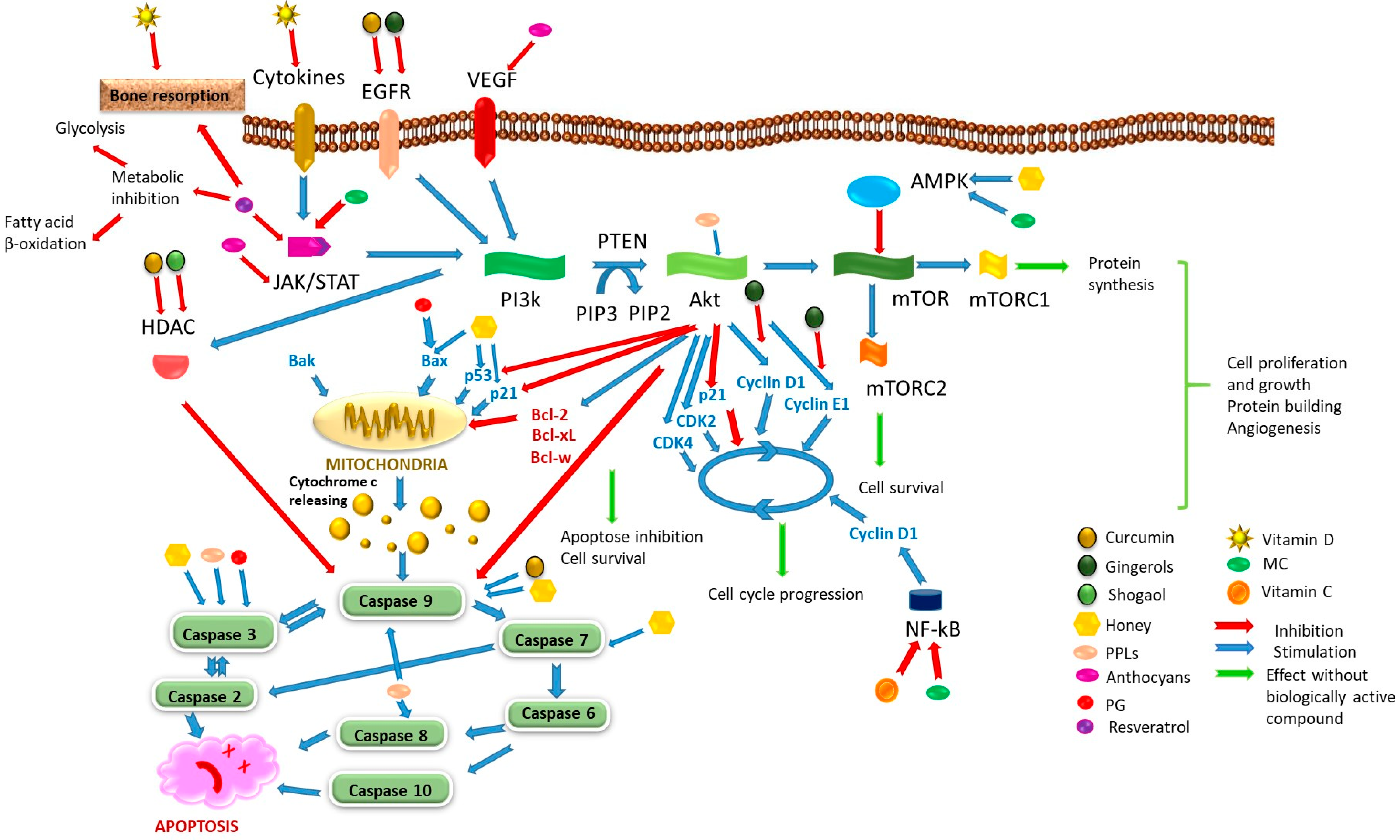 Figure 4. Summary of the main mechanisms modulated by certain natural substances including the nature and location of their molecular influence on these cell signaling pathways. The biological effects ilustrated represent those occuring in the absence of biologically active compounds. The intervention sites are marked as stimulatory (blue arrow) or inhibitory (red arrow). Natural compounds modify these responses by inducing apoptosis, cell cycle arrest, and the inhibition of angiogenesis protein synthesis, ultimately leading to cancer cell death. (EGFR—epidermal growth factor receptor; VEGF—vascular endothelial growth factor; HDAC—histone deacetylases; JAK—Janus kinase; STAT—signal transducer and activator of transcription; PTEN—phosphatase and tensin homolog; PIP3—phosphatidylinositol triphosphate; PIP2—phosphatidylinositol bisphosphate; AkT—protein kinase B; AMPK—AMP-activated protein kinase; PI3k—phosphatidylinositol-3 kinase; mTOR—mammalian target of rapamycin; mTORC—mechanicistic target of rapamicyn complex; NF-kB—nuclear factor-kB; CDK—cyclin-dependent kinase).