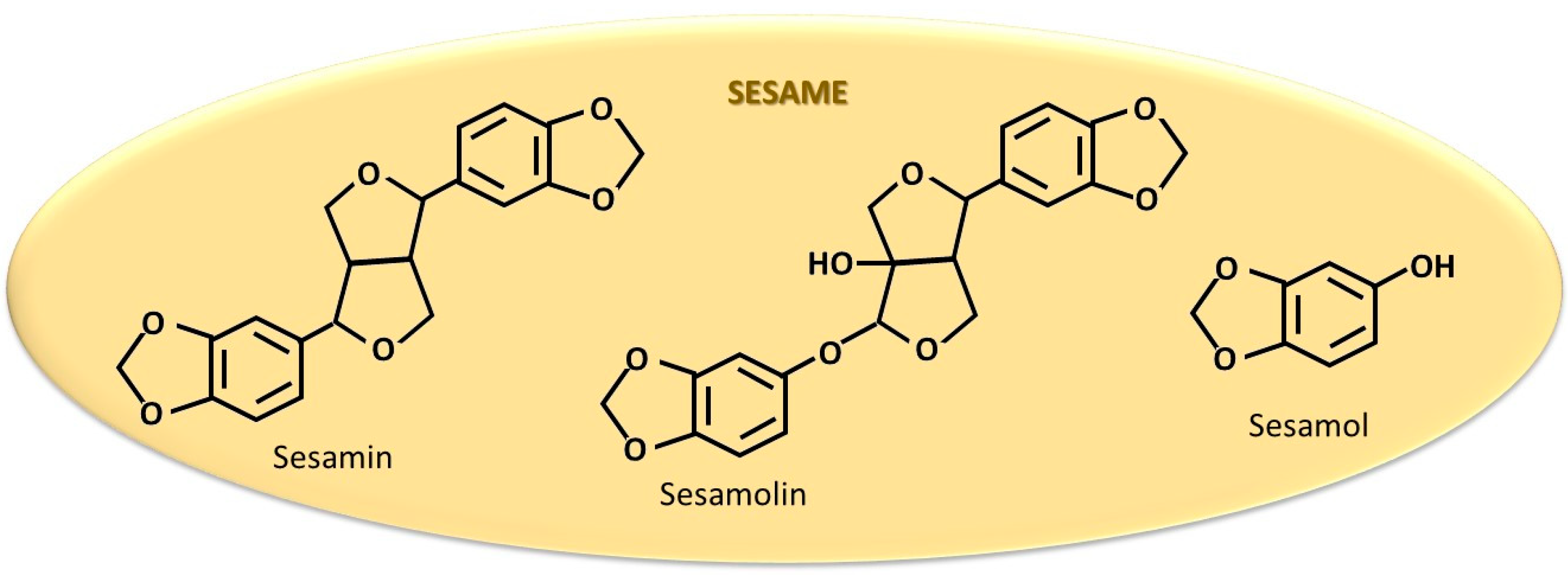 SesameSesamin [258], sesamol [259]Sesamin [276]Sesamin [273], sesame seeds and oil [274]