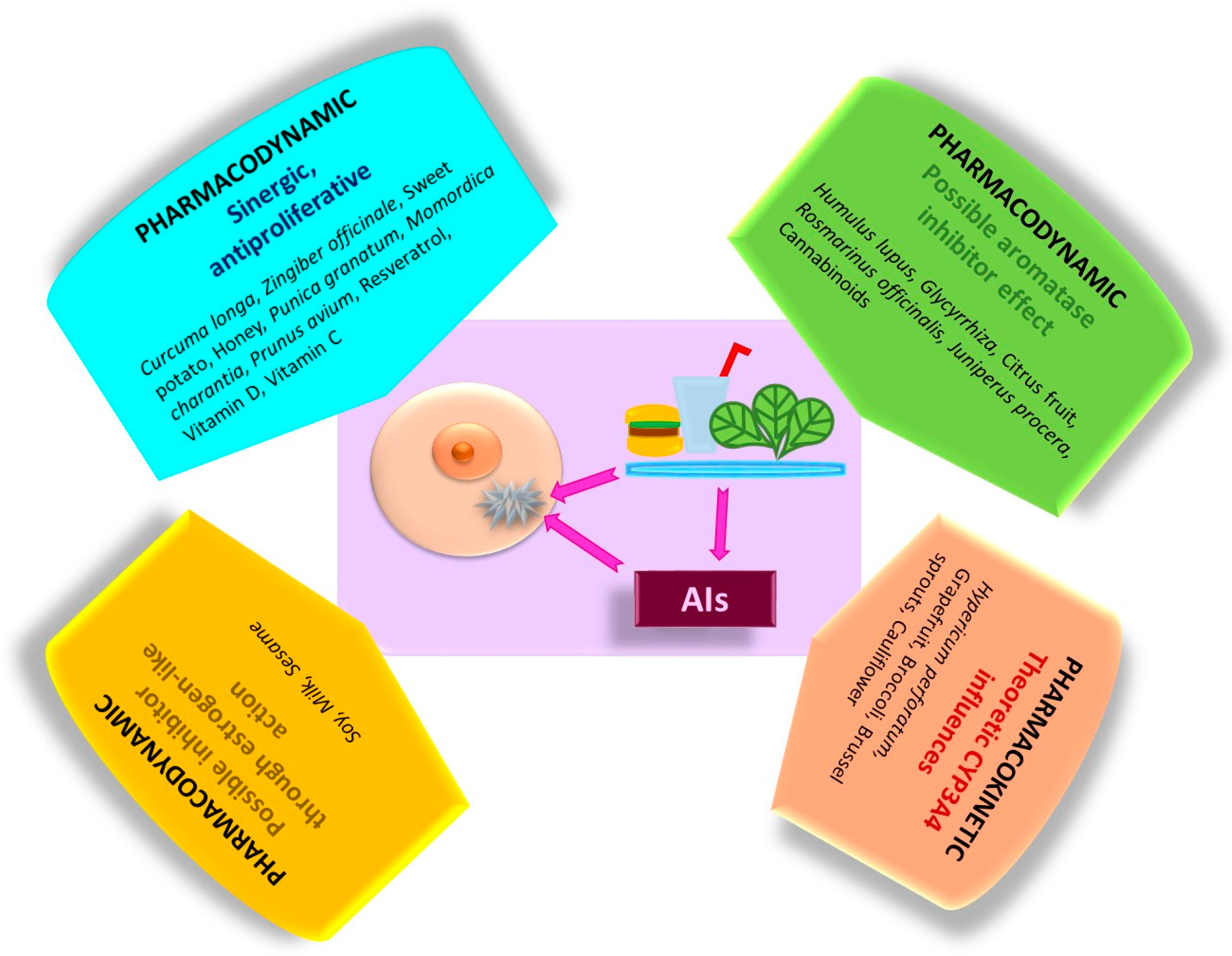 In the first section, we describe the role of aromatase in estrogen biosynthesis and provide the structural details of AIs widely used today, specifically, letrozole, anastrozole, and exemestane. For this description, the previously mentioned review articles have proven the most useful contributions to the conception of the initial schemes in the manuscript. In the second section, we examine the pharmacodynamic interactions between AIs and specific molecules introduced through dietary intake, alongside recent publications regarding their effects on ER or aromatase and their influences on AIs’ efficiency. Compounds with well-established and widely studied antiproliferative effects were also included. We searched for original articles and systematic reviews encompassing clinical and preclinical studies that demonstrate the described effects, and here, we outline the clinical consequences and explain their mechanisms of action. The composition and chemical structures of these nutrients were primarily documented from review articles. In the section dedicated to natural products that may inhibit the activity of AIs, we address the common clinical practice among oncologists/gynecologists of advising against the consumption of soy, milk, and sesame products. We present scientific evidence from various studies that either support or refute this practice. To ensure objectivity, we also examine pharmacokinetic factors, even though such interactions are not traditionally considered clinically relevant for AIs.