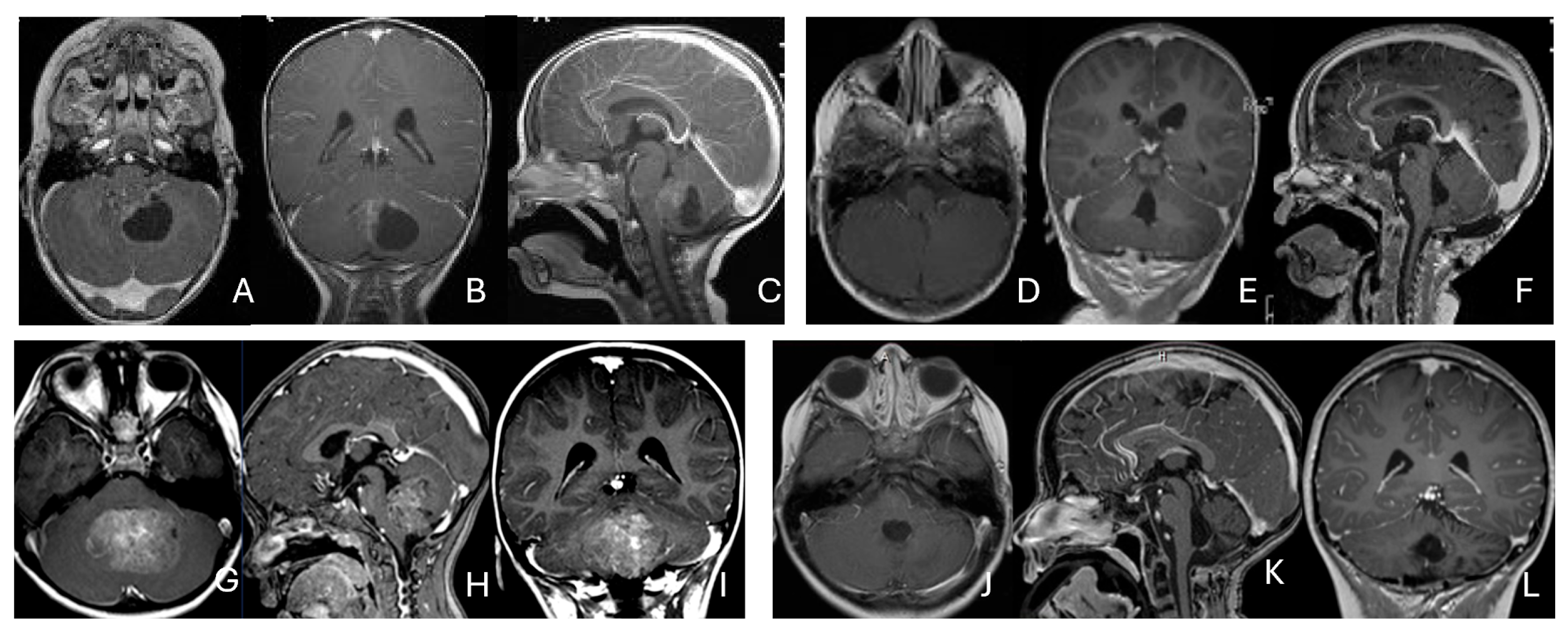 - Jessa, S.; Blanchet-Cohen, A.; Krug, B.; Vladoiu, M.; Coutelier, M.; Faury, D.; Poreau, B.; De Jay, N.; Hébert, S.; Monlong, J.; et al. Stalled Developmental Programs at the Root of Pediatric Brain Tumors. Nat. Genet. 2019, 51, 1702–1713. [Google Scholar] [CrossRef] [PubMed]