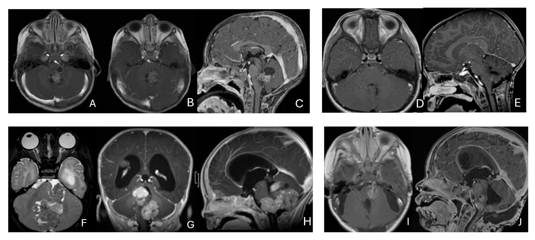 - Silva, A.H.D.; Habermann, S.; Craven, C.L.; Bhagawati, D.; O’Hare, P.; Jorgensen, M.; Dahl, C.; Mankad, K.; Thompson, D.N.P.; Hargrave, D.; et al. Atypical teratoid rhabdoid tumours (ATRTs)—A 21-year institutional experience. Child’s Nerv. Syst. 2023, 39, 1509–1518. [Google Scholar] [CrossRef] [PubMed]