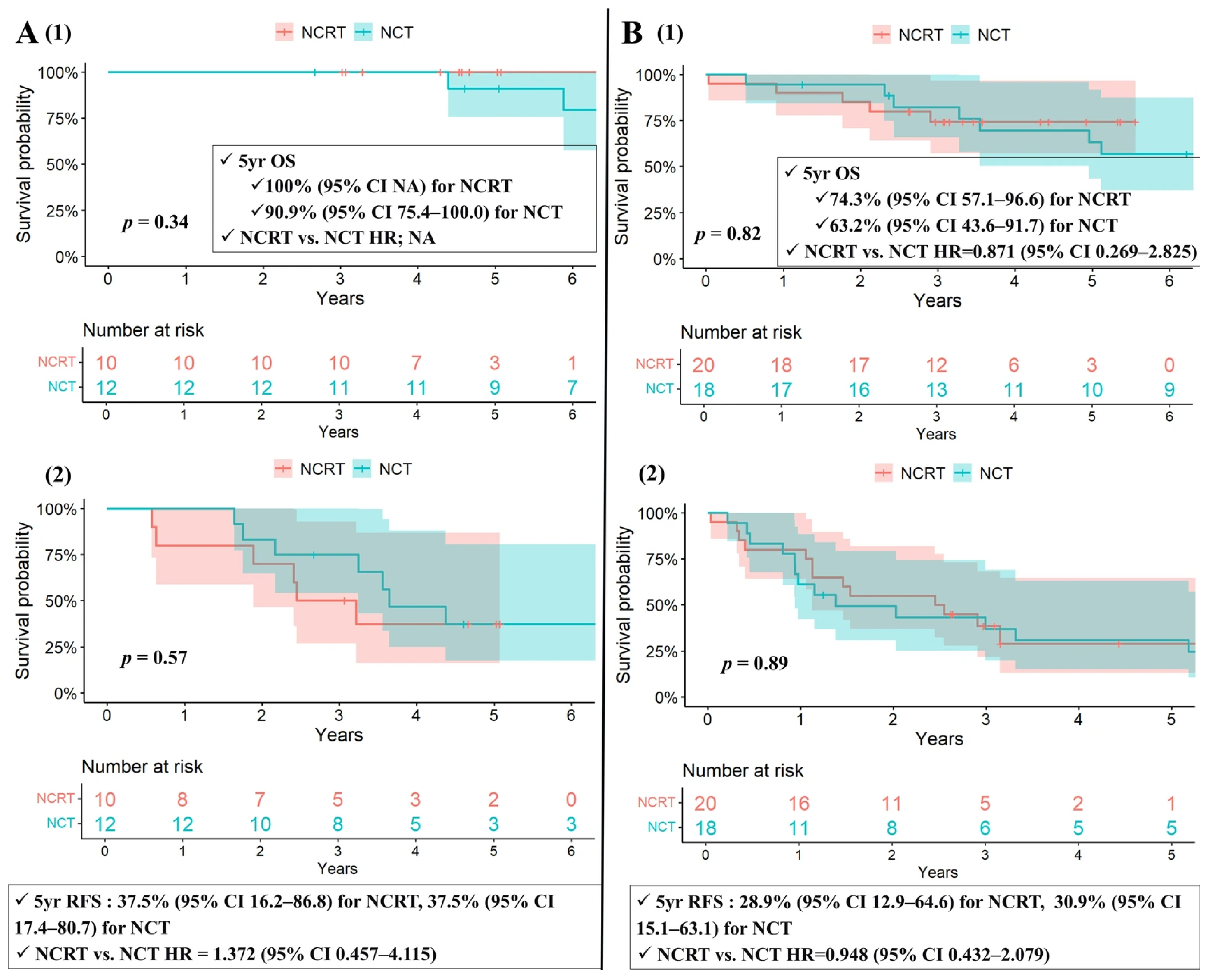 | Total (n = 98) | NCRT (n = 30) | NCT (n = 68) | Gray’s p Value | NCRT (n = 30) | NCT (n = 30) | Gray’s p Value | |