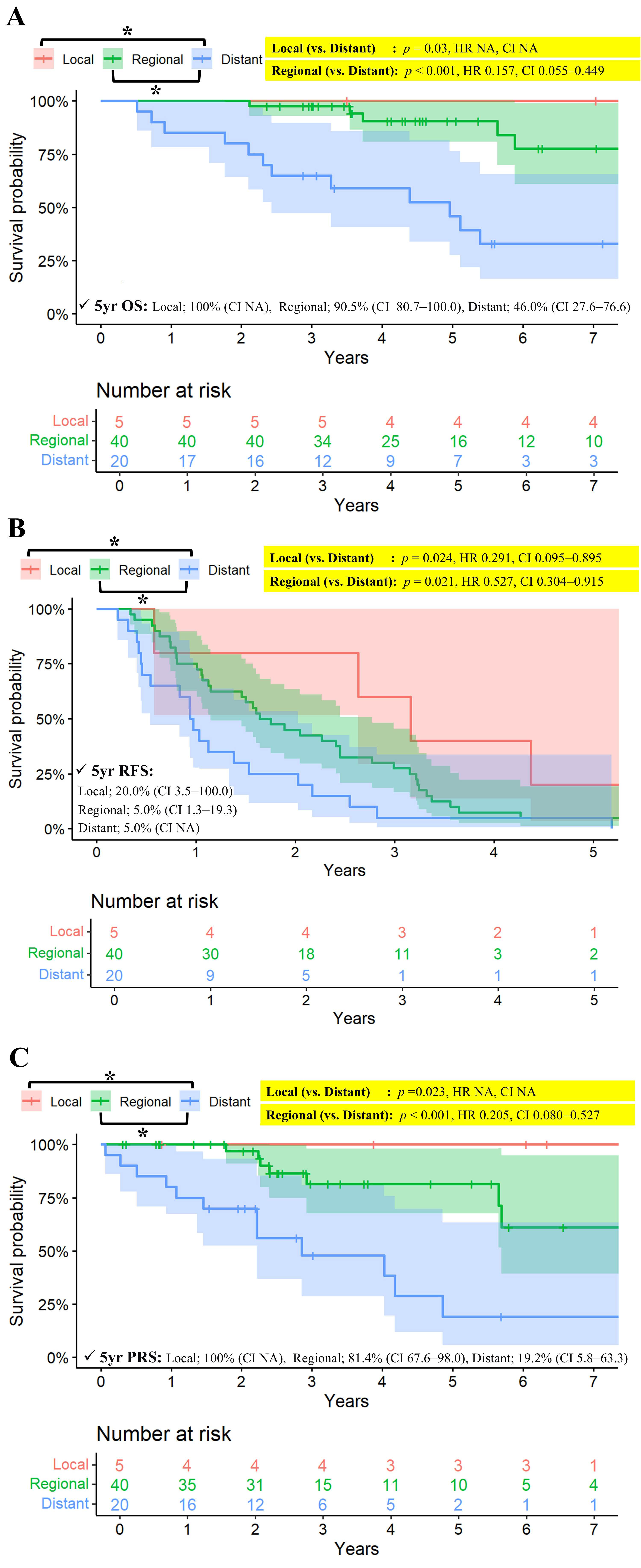 | Distant | 30.8% (n = 20) | 29.4% (n = 5) | 31.3% (n = 15) | 0.888 | |||