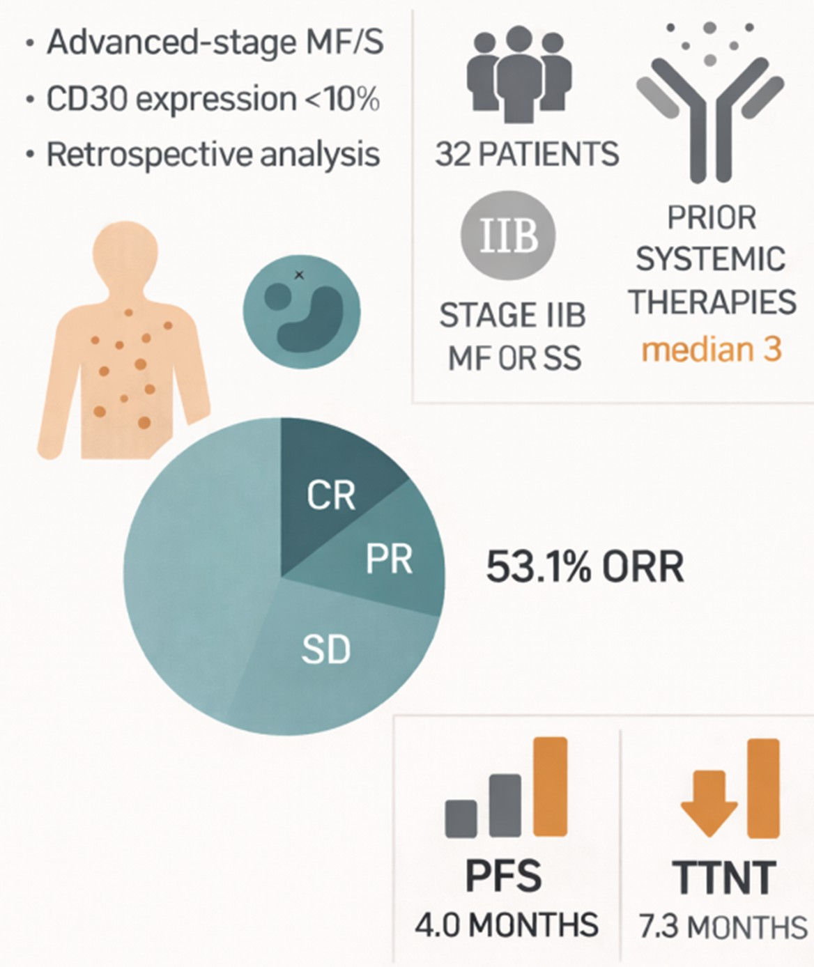 | Papadavid et al., 2021 EORTC real-world [22] | Retrospective, multicenter; 72 pts | Mostly (71/72 patients) advanced stage MF/SS (Stage IIB to IVB). Patients received at least one systemic therapy. 34/72 patients heavily pretreated (≥3 therapies) | IHC | CD30% as continuous & grouped | Responses across CD30% levels; not powered for cutoffs; supports no strict minimum. |